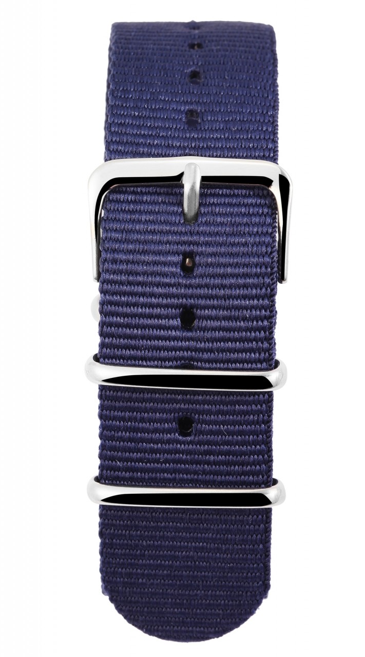 A pulseira de relógio em náilon azul escuro está disponível em larguras de 14 mm, 16 mm, 18 mm, 20 mm e 22 mm. Ele pode ser facilmente fixado à caixa do relógio usando duas barras de mola padrão. A pulseira do relógio tem comprimento total de 24,5 cm, 25,5 cm, 26,5 cm e 28 cm. O comprimento total depende da largura do terminal. A pulseira pode ser aberta e fechada com uma fivela prateada. Além disso, dois laços de metal estão firmemente costurados na pulseira. O material macio torna a pulseira do relógio particularmente confortável de usar. A aparência simples permite que a pulseira de substituição seja fixada em qualquer tipo de relógio. Adapta-se visualmente bem à aparência geral dos relógios.