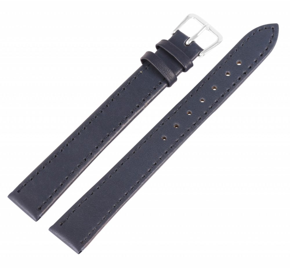 A pulseira de relógio azul escuro feita de couro genuíno está disponível em larguras de 10 mm a 24 mm e em uma embalagem de seis peças. Tem uma superfície lisa e acabamento com uma fina costura azul escura. A espessura do material é de 2 mm. A pulseira de reposição XL tem um comprimento total entre 21,5 cm e 24 cm, dependendo da largura da alça. A alça do fecho é 2 mm mais estreita que a largura da alça porque a faixa é estreitamente estreita. A pulseira de substituição pode ser aberta e fechada com uma fivela prateada altamente polida. O acabamento brilhante em combinação com a pulseira de couro liso sublinha o belo design da…