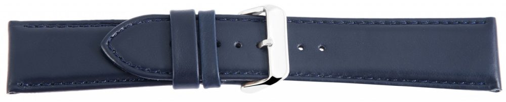 A pulseira do relógio azul escuro, também com costura azul escura, é feita de couro genuíno e está disponível em larguras de 18 mm, 20 mm, 22 mm e 24 mm. A alça do fecho é 2 mm mais estreita que a largura da alça porque a pulseira fica mais estreita ali. O comprimento total da banda é de 22 cm e a espessura do material é de 5 mm. A pulseira de substituição pode ser aberta e fechada com uma fivela prateada altamente polida. O acabamento brilhante em combinação com a pulseira de couro liso sublinha o belo design da pulseira do relógio e garante uma colocação e retirada rápida e fácil.