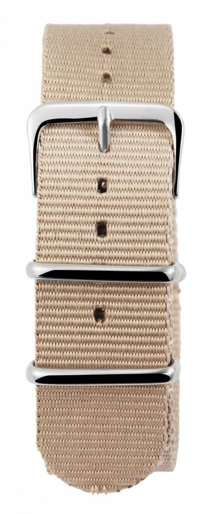 A pulseira de náilon bege está disponível em larguras de 14 mm, 16 mm, 18 mm, 20 mm e 22 mm. Ele pode ser facilmente fixado à caixa do relógio usando duas barras de mola padrão. A pulseira do relógio tem comprimento total de 24,5 cm, 25,5 cm, 26,5 cm e 28 cm. O comprimento total depende da largura do terminal. A pulseira pode ser aberta e fechada com uma fivela prateada. Além disso, dois laços de metal estão firmemente costurados na pulseira. O material macio torna a pulseira do relógio particularmente confortável de usar. A aparência simples permite que a pulseira de substituição seja fixada em qualquer tipo de relógio. Adapta-se visualmente bem à aparência geral dos relógios.