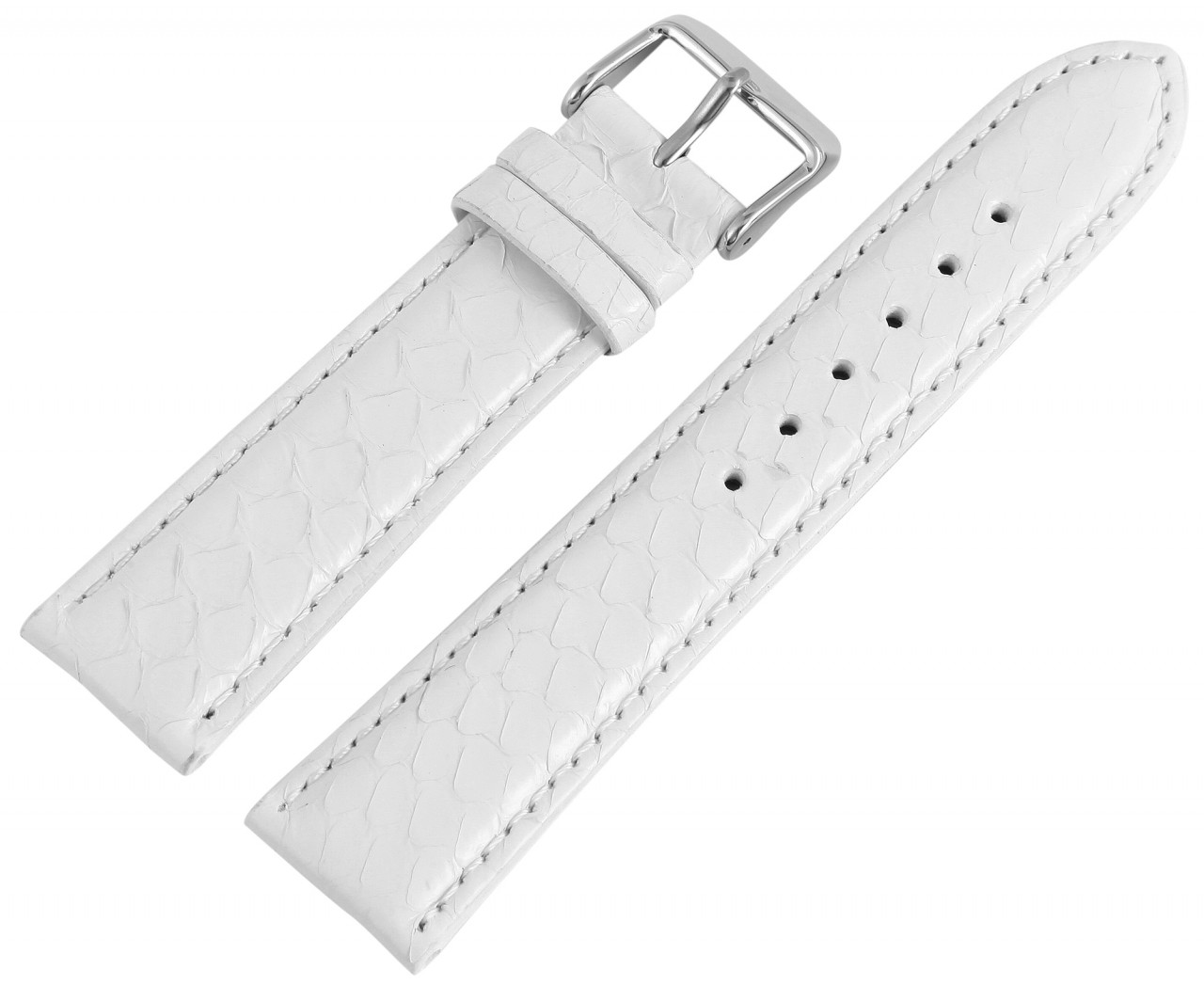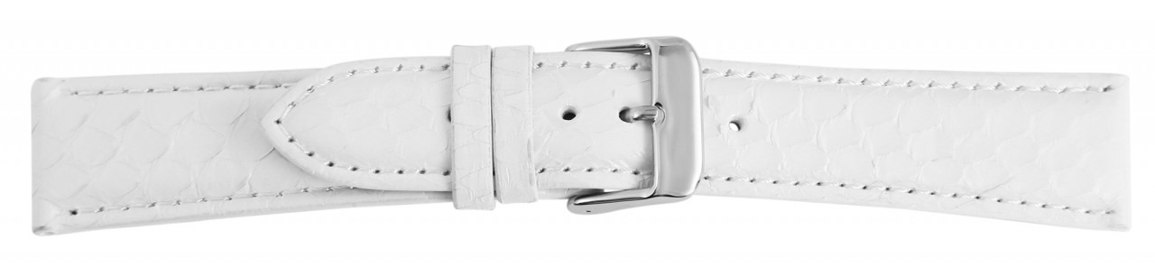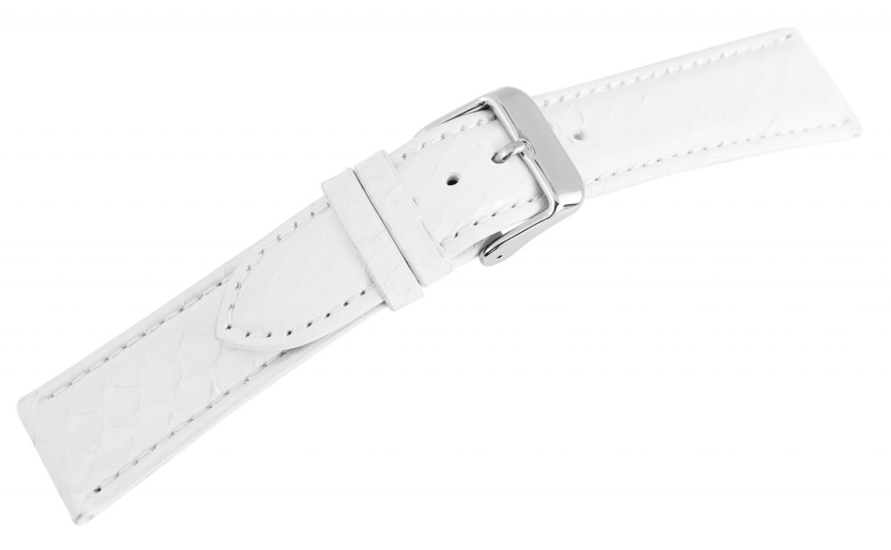 Pulseira de substituição em couro legítimo na cor branca. A costura externa é branca da mesma cor. A pulseira tem laterais acolchoadas. Foi feito de pele de cobra genuína. A pulseira tem uma fivela prateada e duas presilhas. A parte do furo afunila até uma ponta no final.
