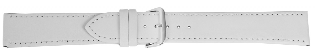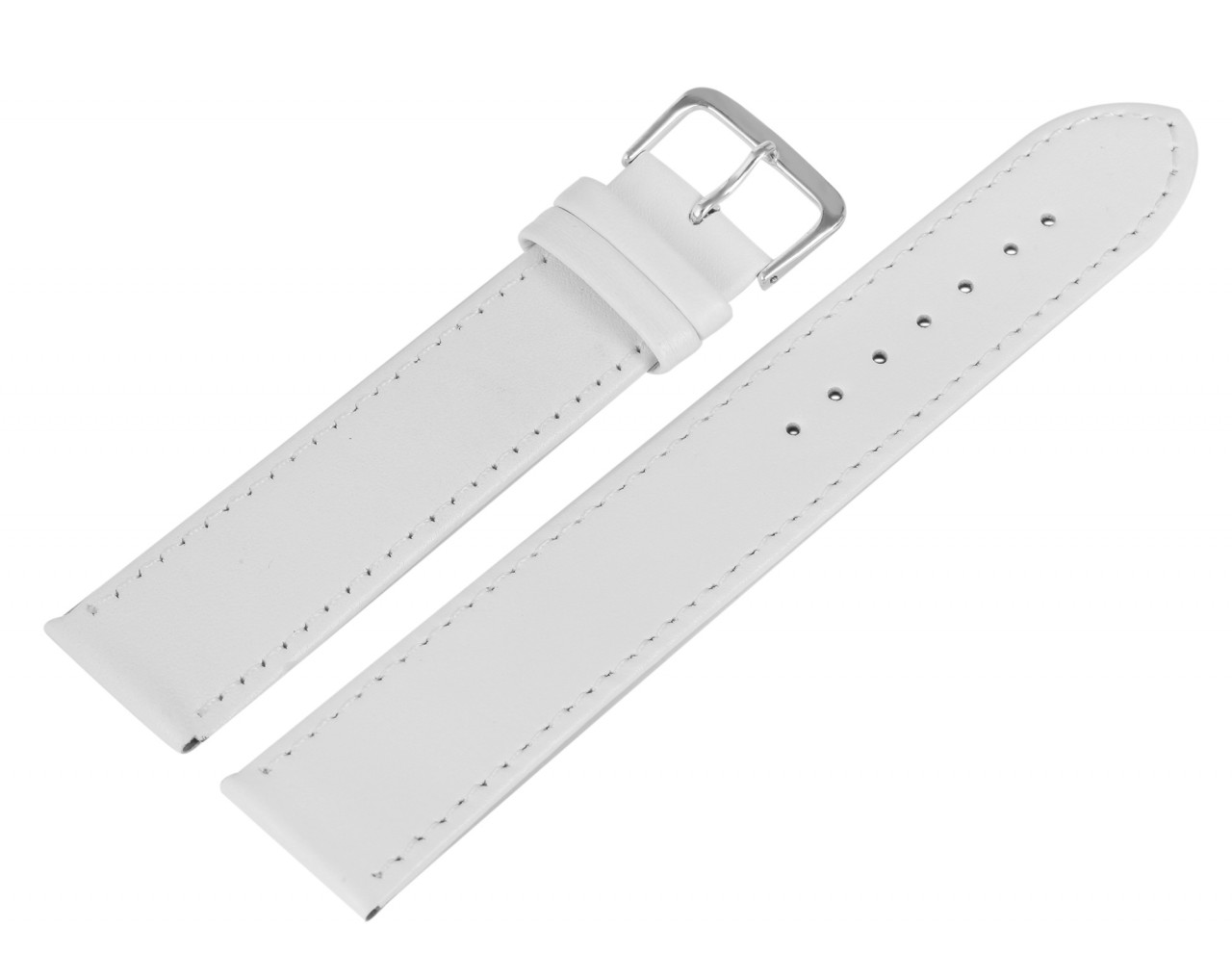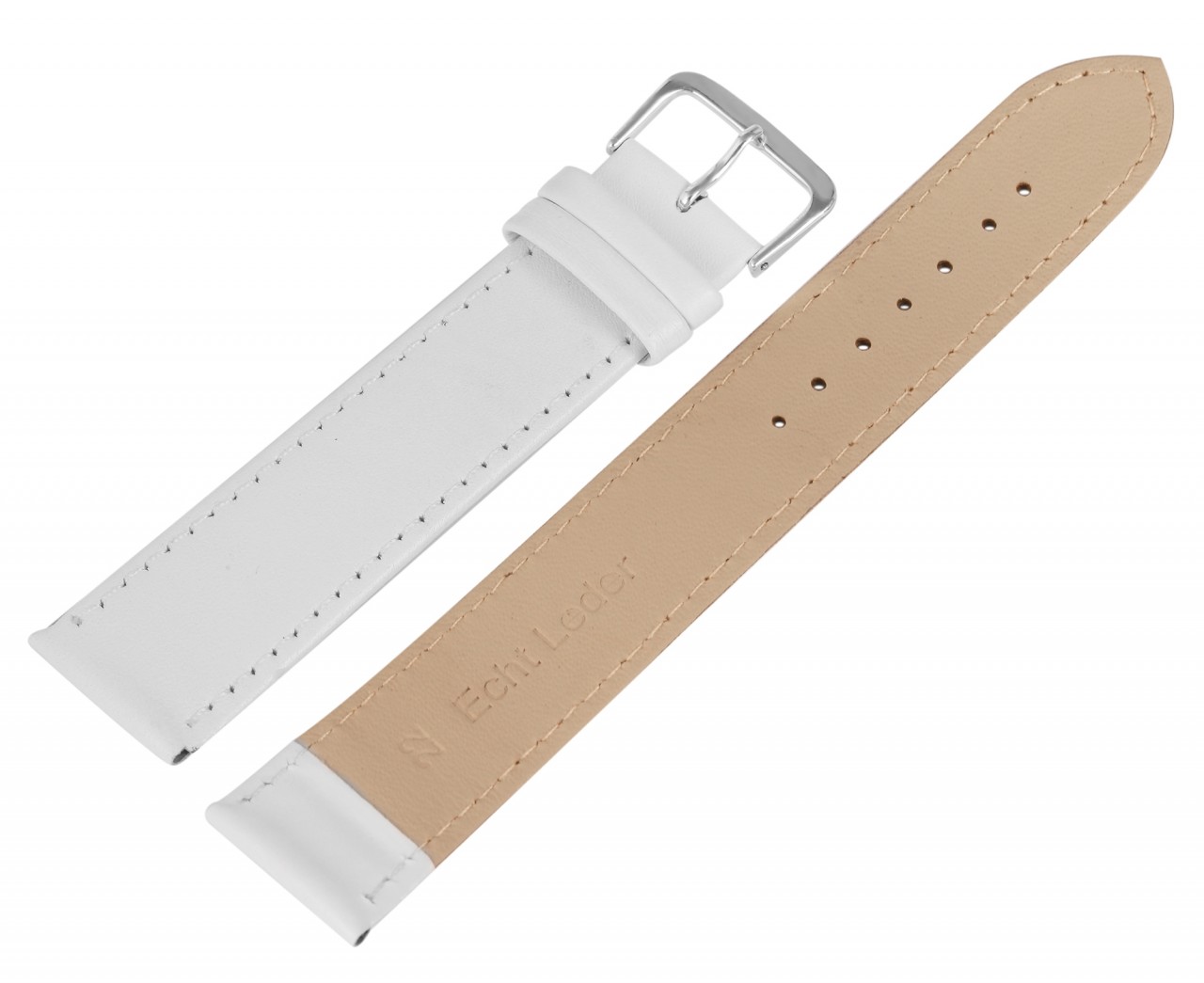 A pulseira de relógio branca feita de couro genuíno está disponível em larguras de 10 mm a 24 mm e em uma embalagem de seis peças. Possui superfície lisa e acabamento com fina costura branca. A espessura do material é de 2 mm. A pulseira de substituição XL tem um comprimento total entre 21,5 cm e 24 cm, dependendo da largura da alça. A alça do fecho é 2 mm mais estreita que a largura da alça porque a faixa é estreitamente estreita. A pulseira de substituição pode ser aberta e fechada com uma fivela prateada altamente polida. O acabamento brilhante em combinação com a pulseira de couro liso sublinha o belo design da pulseira do relógio e garante uma colocação e retirada rápida e fácil.