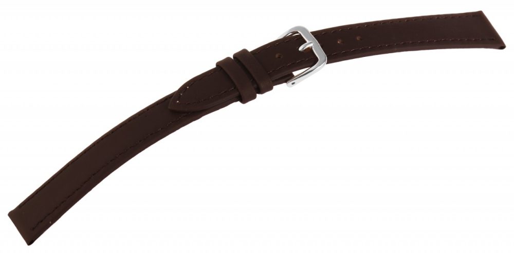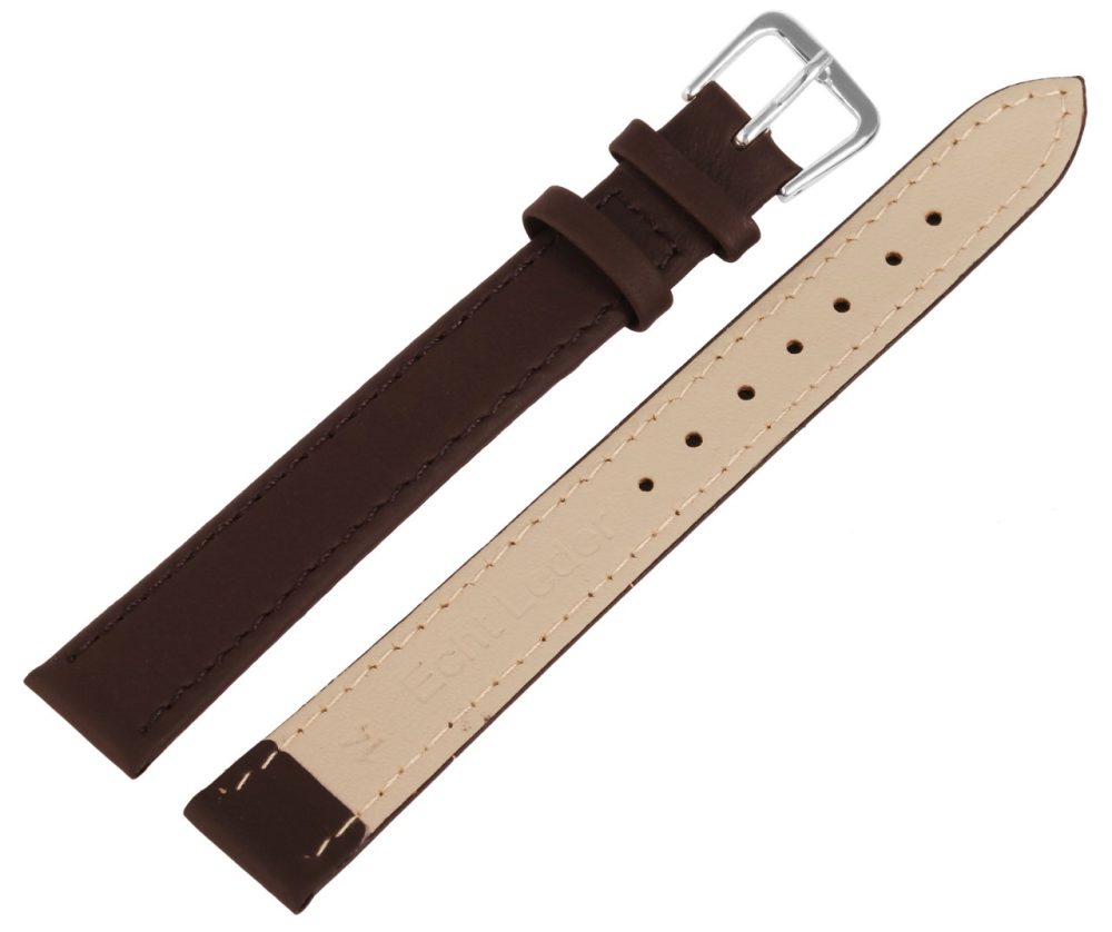 A pulseira de relógio castanho escuro feita de couro genuíno está disponível em larguras de 10 mm – 24 mm e em uma embalagem de seis peças. Tem uma superfície fina mate e acabamento com uma costura castanha escura. A espessura do material é de 2 mm. A pulseira de reposição XL tem um comprimento total entre 21,5 cm e 24 cm, dependendo da largura da alça. A alça do fecho é 2 mm mais estreita que a largura da alça porque a faixa é estreitamente estreita. A pulseira de substituição pode ser aberta e fechada com uma fivela prateada altamente polida. O acabamento brilhante em combinação com a pulseira de couro fosco realça o belo design da pulseira do relógio e garante que ela possa ser colocada e retirada com rapidez e facilidade.