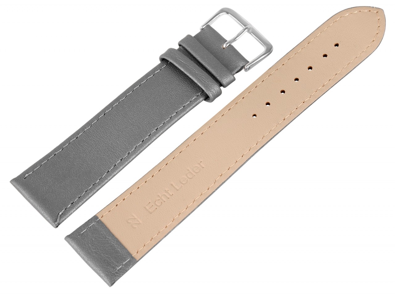 A pulseira de relógio cinza claro feita de couro genuíno está disponível em larguras de 10 mm – 24 mm e em uma embalagem de seis peças. Tem uma superfície lisa e acabamento com uma fina costura cinza. A espessura do material é de 2 mm. A pulseira de substituição XL tem um comprimento total entre 21,5 cm e 24 cm, dependendo da largura da alça. A alça do fecho é 2 mm mais estreita que a largura da alça porque a faixa é estreitamente estreita. A pulseira de substituição pode ser aberta e fechada com uma fivela prateada altamente polida. O acabamento brilhante em combinação com a pulseira de couro liso sublinha o belo design da pulseira do relógio e garante uma colocação e retirada rápida e fácil.