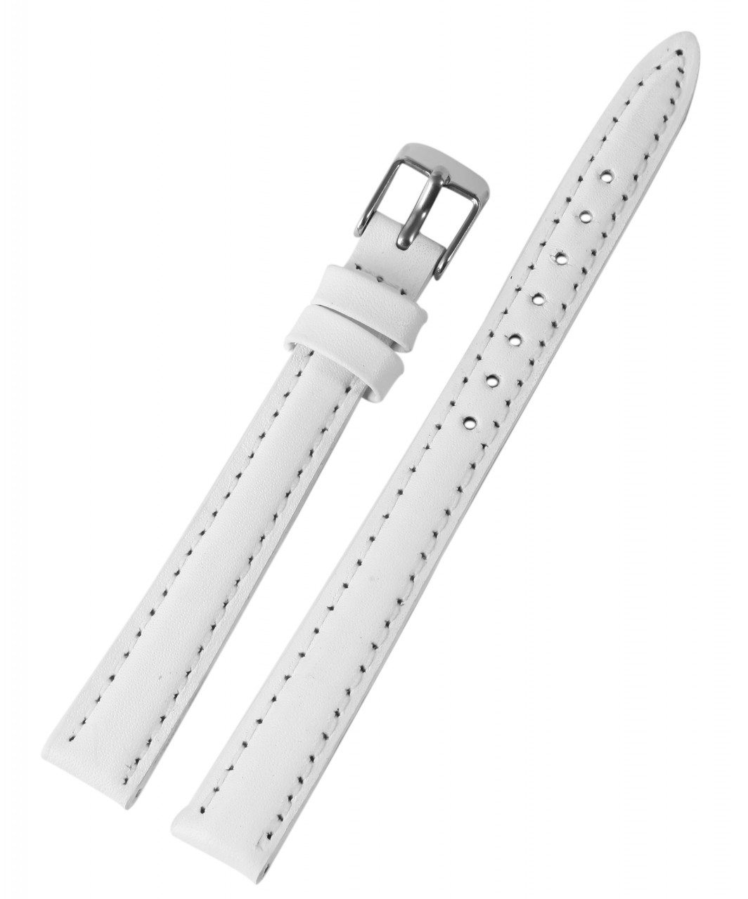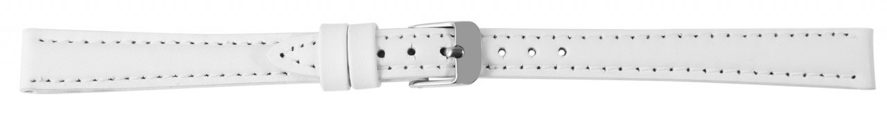 A pulseira branca feita de couro genuíno está disponível em larguras de 10 mm a 24 mm. Tem uma superfície lisa, é levemente acolchoada e tem uma fina costura branca. A espessura do material é de 3,5 mm. A pulseira de substituição tem um comprimento total entre 20,5 cm e 22 cm, que depende da largura da saliência. A alça do fecho é 2 mm mais estreita que a largura da alça porque a faixa é estreitamente estreita. A pulseira pode ser aberta e fechada com uma fivela prateada altamente polida. O acabamento brilhante em combinação com a pulseira de couro liso sublinha o belo design da pulseira do relógio e garante uma colocação e retirada rápida e fácil. Você também pode dar um novo visual ao seu relógio rapidamente com esta pulseira.