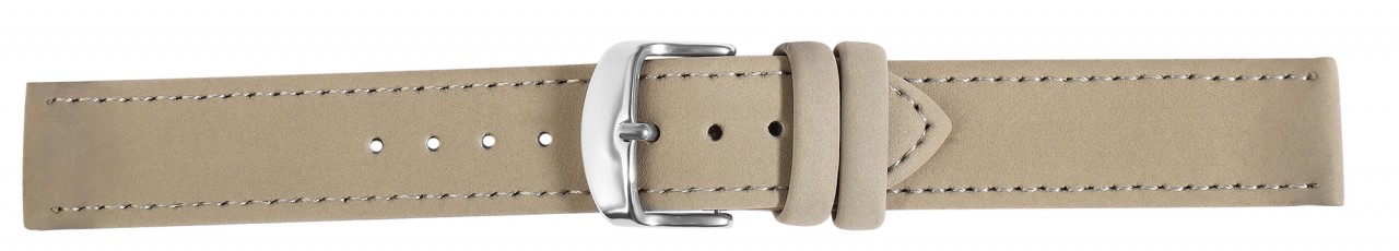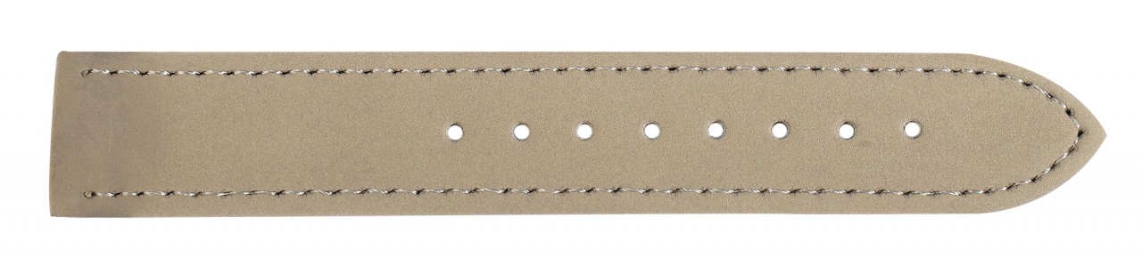 A pulseira cinza feita de couro genuíno está disponível em larguras de 12 a 22 mm. Tem 2 mm de espessura e superfície ligeiramente rugosa com costura cinzenta. O comprimento total da banda está entre 19,5 cm e 21 cm. O comprimento depende da largura do talão. A pulseira pode ser aberta e fechada com uma fivela prateada.