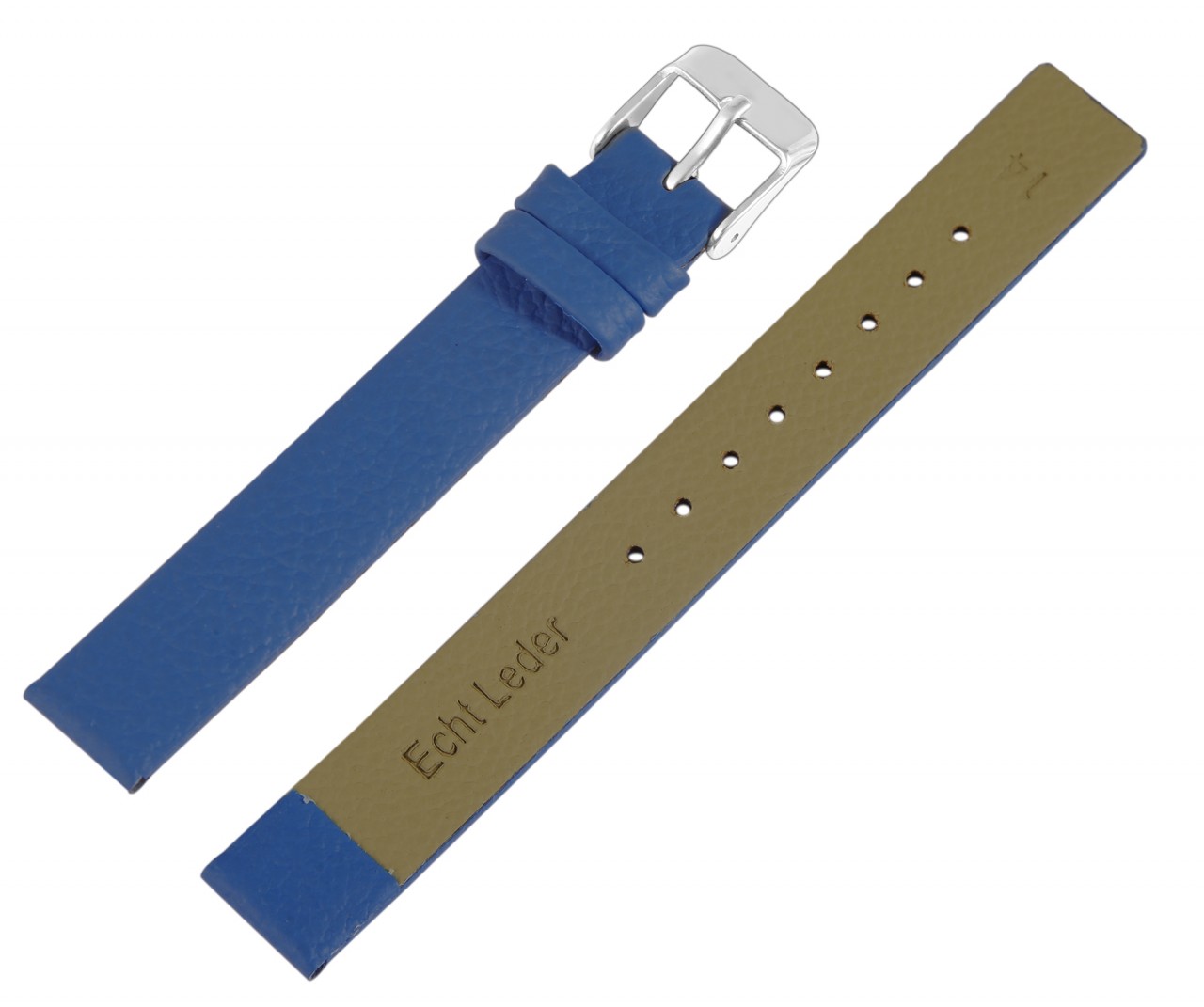 A pulseira do relógio azul claro é feita de couro genuíno e tem uma largura de 14 mm. O comprimento total da banda é de 20,5 cm e a espessura do material é de 3 mm. A pulseira pode ser aberta e fechada com uma fivela prateada altamente polida. O acabamento brilhante em combinação com a pulseira de couro levemente fosco sublinha o belo design da pulseira do relógio e garante que ela possa ser colocada e retirada com rapidez e facilidade.