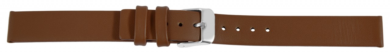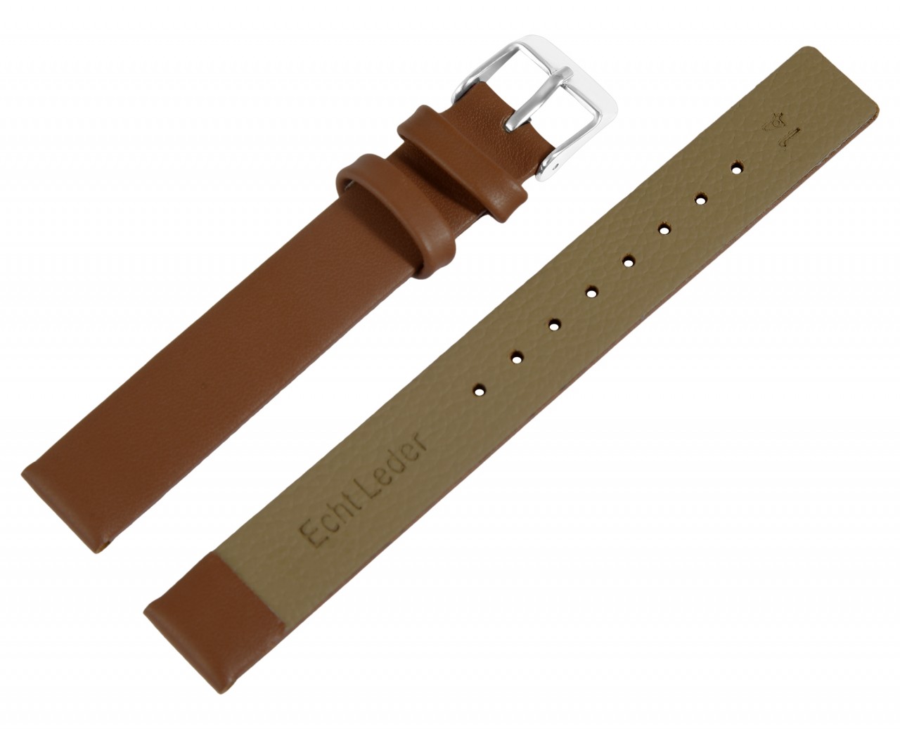A pulseira castanha do relógio é feita de couro genuíno e tem uma largura de 14 mm. O comprimento total da banda é de 20,5 cm e a espessura do material é de 3 mm. A pulseira pode ser aberta e fechada com uma fivela prateada altamente polida. O acabamento brilhante em combinação com a pulseira de couro liso sublinha o belo design da pulseira do relógio e garante uma colocação e retirada rápida e fácil.
