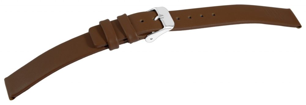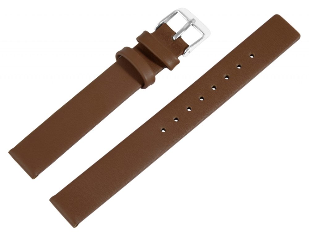 A pulseira castanha do relógio é feita de couro genuíno e tem uma largura de 14 mm. O comprimento total da banda é de 20,5 cm e a espessura do material é de 3 mm. A pulseira pode ser aberta e fechada com uma fivela prateada altamente polida. O acabamento brilhante em combinação com a pulseira de couro liso sublinha o belo design da pulseira do relógio e garante uma colocação e retirada rápida e fácil.