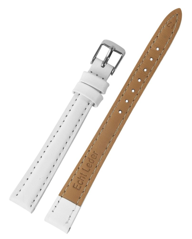 A pulseira branca feita de couro genuíno está disponível em larguras de 10 mm a 24 mm. Tem uma superfície lisa, é levemente acolchoada e tem uma fina costura branca. A espessura do material é de 3,5 mm. A pulseira de substituição tem um comprimento total entre 20,5 cm e 22 cm, que depende da largura da saliência. A alça do fecho é 2 mm mais estreita que a largura da alça porque a faixa é estreitamente estreita. A pulseira pode ser aberta e fechada com uma fivela prateada altamente polida. O acabamento brilhante em combinação com a pulseira de couro liso sublinha o belo design da pulseira do relógio e garante uma colocação e retirada rápida e fácil. Você também pode dar um novo visual ao seu relógio rapidamente com esta pulseira.