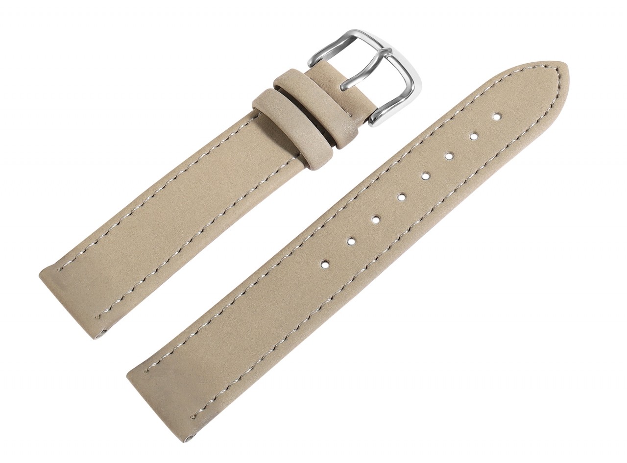 A pulseira cinza feita de couro genuíno está disponível em larguras de 12 a 22 mm. Tem 2 mm de espessura e superfície ligeiramente rugosa com costura cinzenta. O comprimento total da banda está entre 19,5 cm e 21 cm. O comprimento depende da largura do talão. A pulseira pode ser aberta e fechada com uma fivela prateada.
