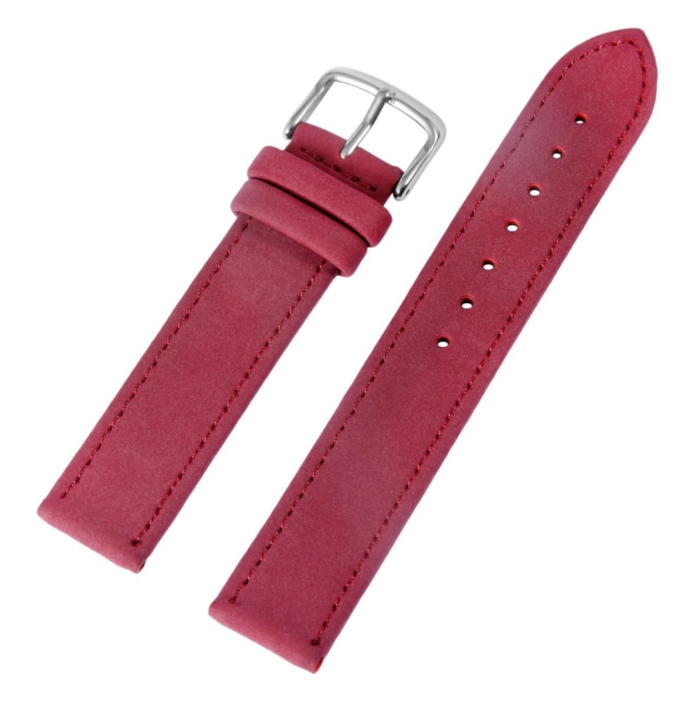A pulseira vermelha escura feita de couro genuíno está disponível em larguras de 12 a 18 mm. Tem 2 mm de espessura e superfície ligeiramente rugosa com costura vermelha escura. O comprimento total da banda está entre 19,5 cm e 20,5 cm. O comprimento depende da largura do talão. A pulseira pode ser aberta e fechada com uma fivela prateada.