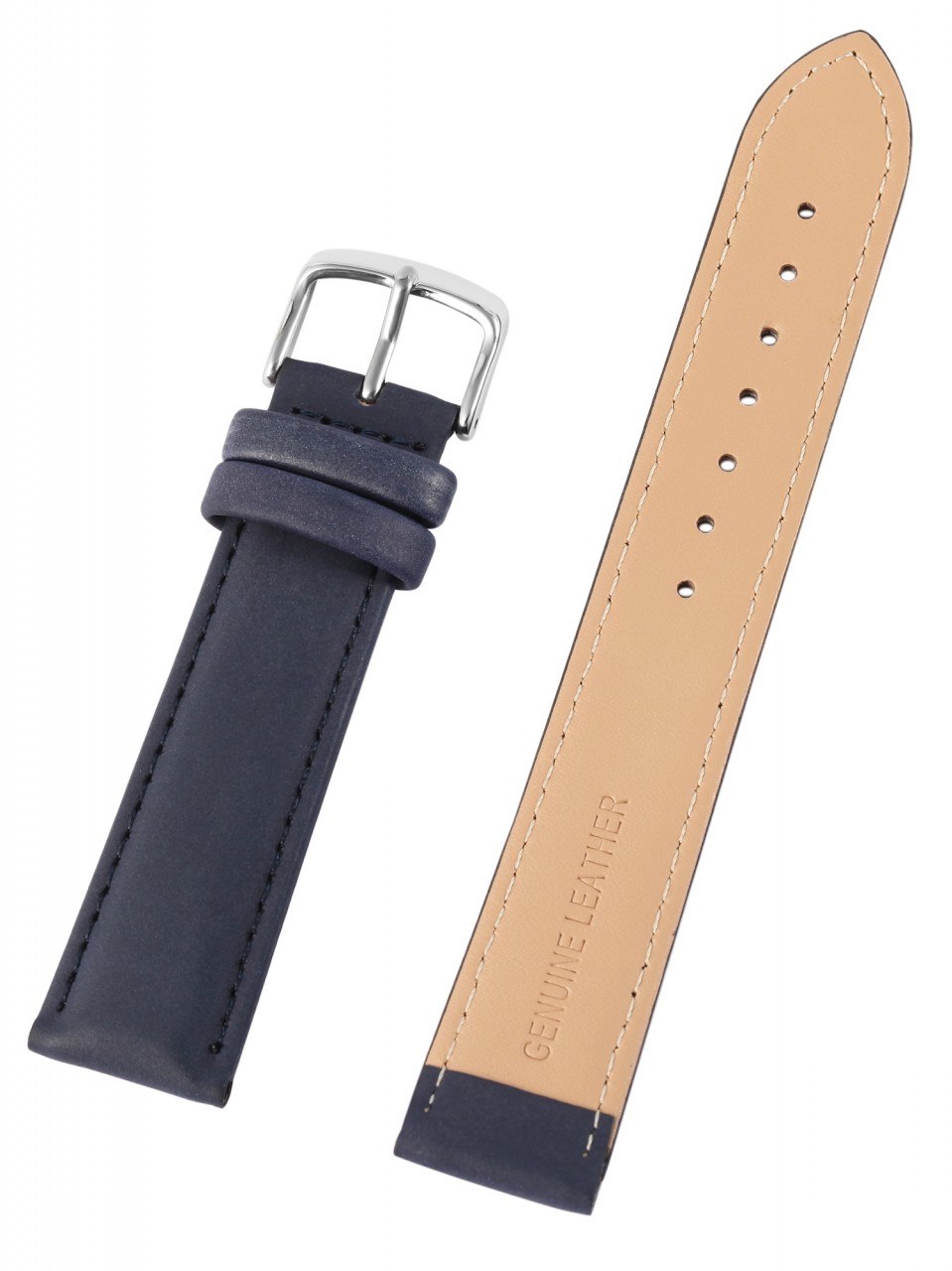 A pulseira azul escura feita de couro genuíno está disponível em larguras de 18, 20, 22 e 24 mm. A pulseira de couro é levemente acolchoada para ter aproximadamente 4 mm de altura. Tem uma superfície ligeiramente rugosa e é cosida com uma costura azul escura no exterior. O comprimento total da faixa está entre 20,5 cm e 21,5 cm. O comprimento total depende da largura do terminal. A alça do fecho é 2 mm mais estreita que a largura da alça porque a faixa é estreitamente estreita. A pulseira de reposição pode ser aberta e fechada com uma fivela prateada.