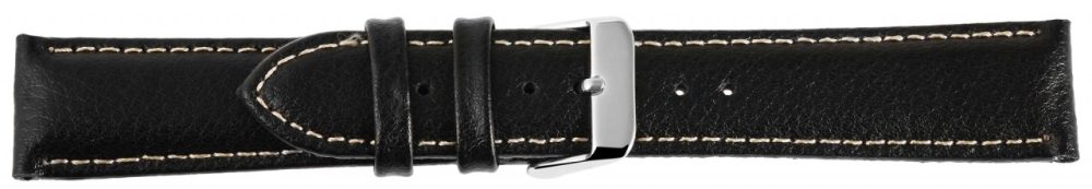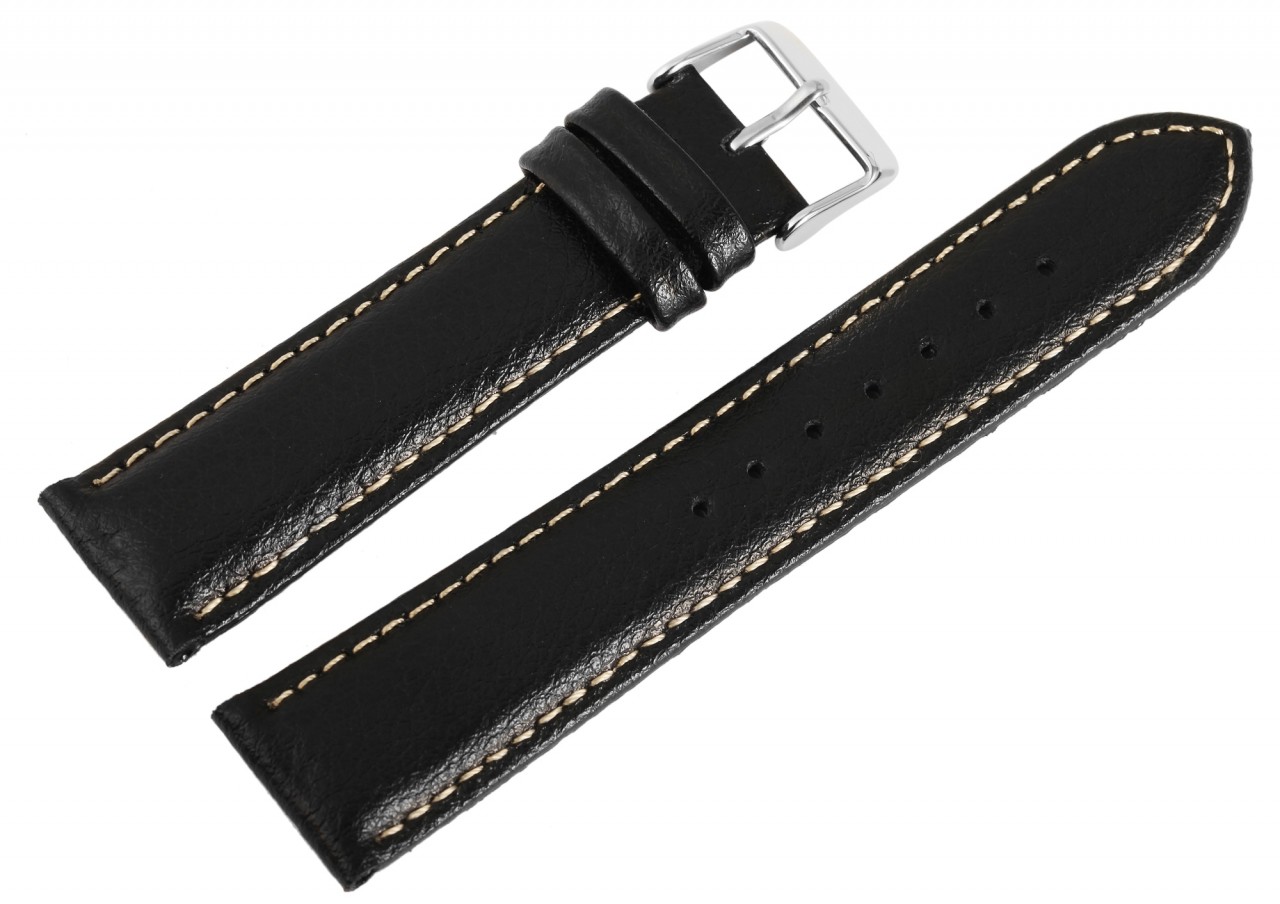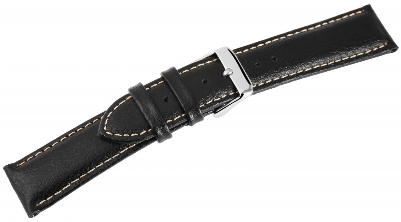 Pulseira básica de couro genuíno em preto decorada com costura branca. A pulseira tem uma fivela prateada e duas presilhas. A parte do furo afunila até uma ponta no final.