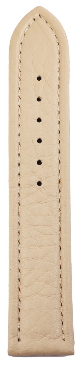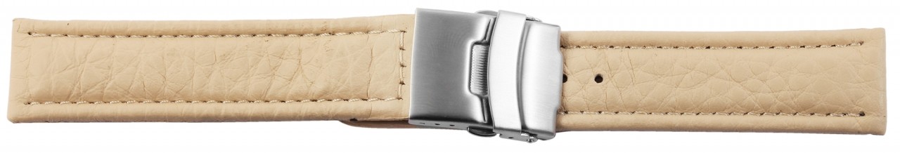 Pulseira clássica em couro genuíno na cor bege. A costura externa é na mesma cor bege. A parte superior da pulseira é parcialmente acolchoada. Foi feito de couro de vaca. A pulseira possui fecho dobrável em aço inoxidável. A parte do furo afunila até uma ponta no final.