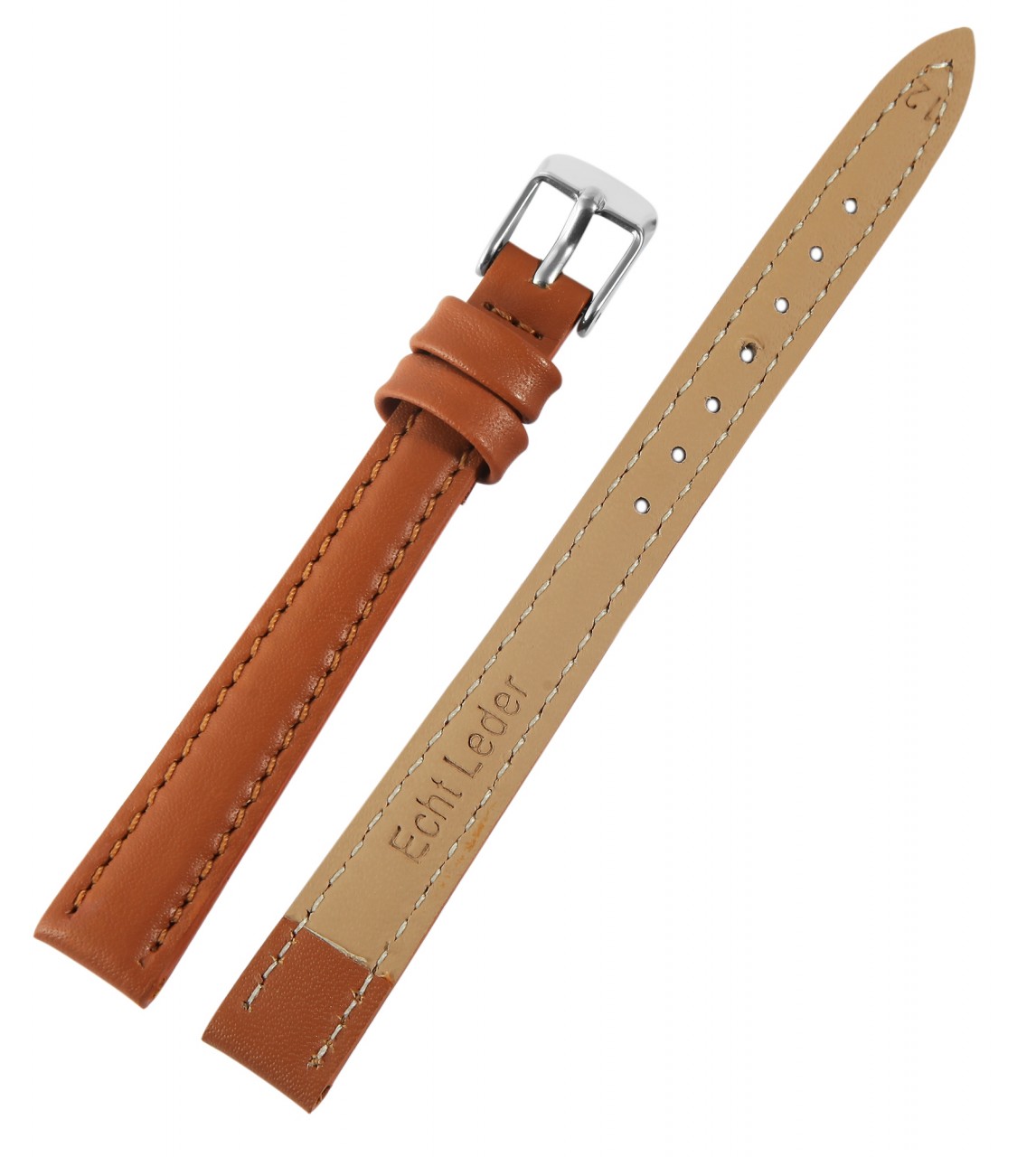 A pulseira castanha feita de couro genuíno está disponível em larguras de 10 mm a 24 mm. Tem uma superfície lisa, é levemente acolchoada e tem uma fina costura castanha. A espessura do material é de 3,5 mm. A pulseira de substituição tem um comprimento total entre 21 cm e 22 cm, que depende da largura da saliência. A alça do fecho é 2 mm mais estreita que a largura da alça porque a faixa é estreitamente estreita. A pulseira pode ser aberta e fechada com uma fivela prateada altamente polida. O acabamento brilhante em combinação com a pulseira de couro liso sublinha o belo design da pulseira do relógio e garante uma colocação e retirada rápida e fácil. Você também pode dar um novo visual ao seu relógio rapidamente com esta pulseira.