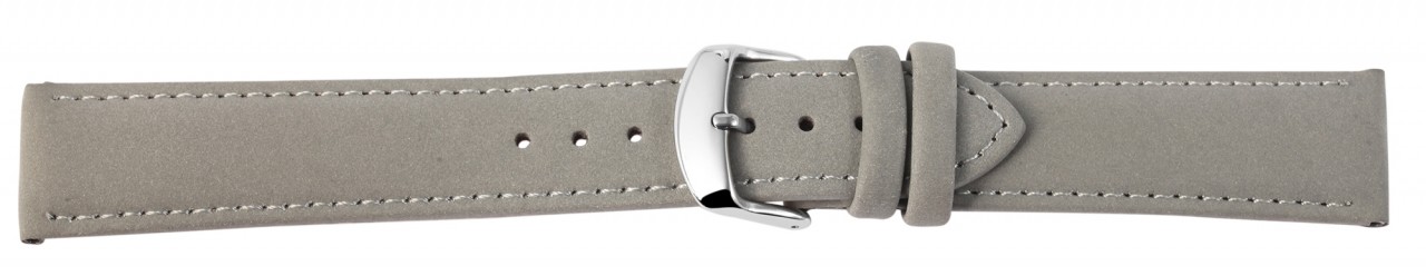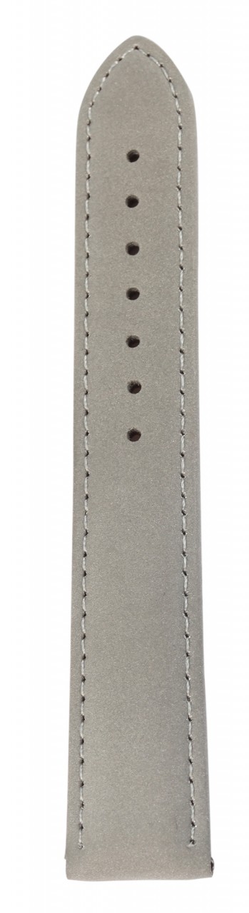 A pulseira cinza feita de couro genuíno está disponível em larguras de 18, 20, 22 e 24 mm. A pulseira de couro é levemente acolchoada para ter aproximadamente 4 mm de altura. Tem uma superfície ligeiramente rugosa e é cosida com uma costura cinzenta no exterior. O comprimento total da faixa está entre 20,5 cm e 21,5 cm. O comprimento total depende da largura do terminal. A alça do fecho é 2 mm mais estreita que a largura da alça porque a faixa é estreitamente estreita. A pulseira de reposição pode ser aberta e fechada com uma fivela prateada.