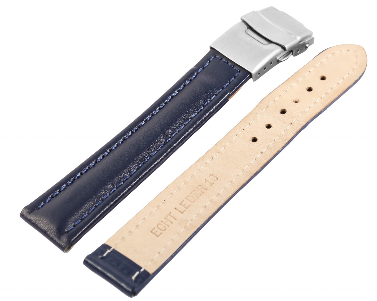 Pulseira clássica em couro genuíno na cor azul escuro. A costura externa é em azul combinando. A parte superior da pulseira é acolchoada. Foi feito de couro de vaca. A pulseira possui fecho dobrável em aço inoxidável. A parte do furo afunila até uma ponta no final.