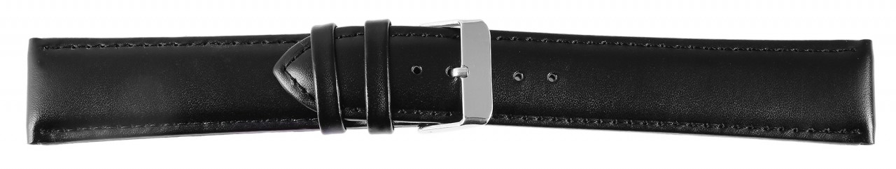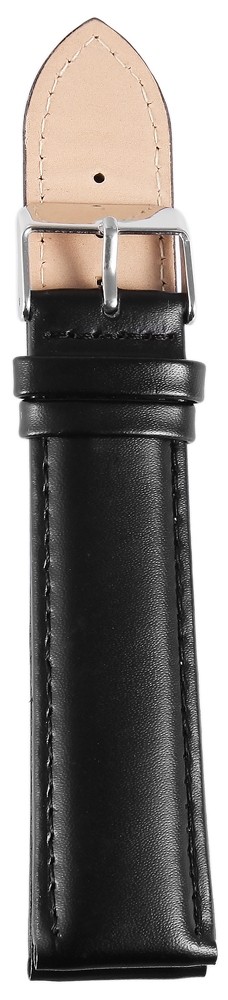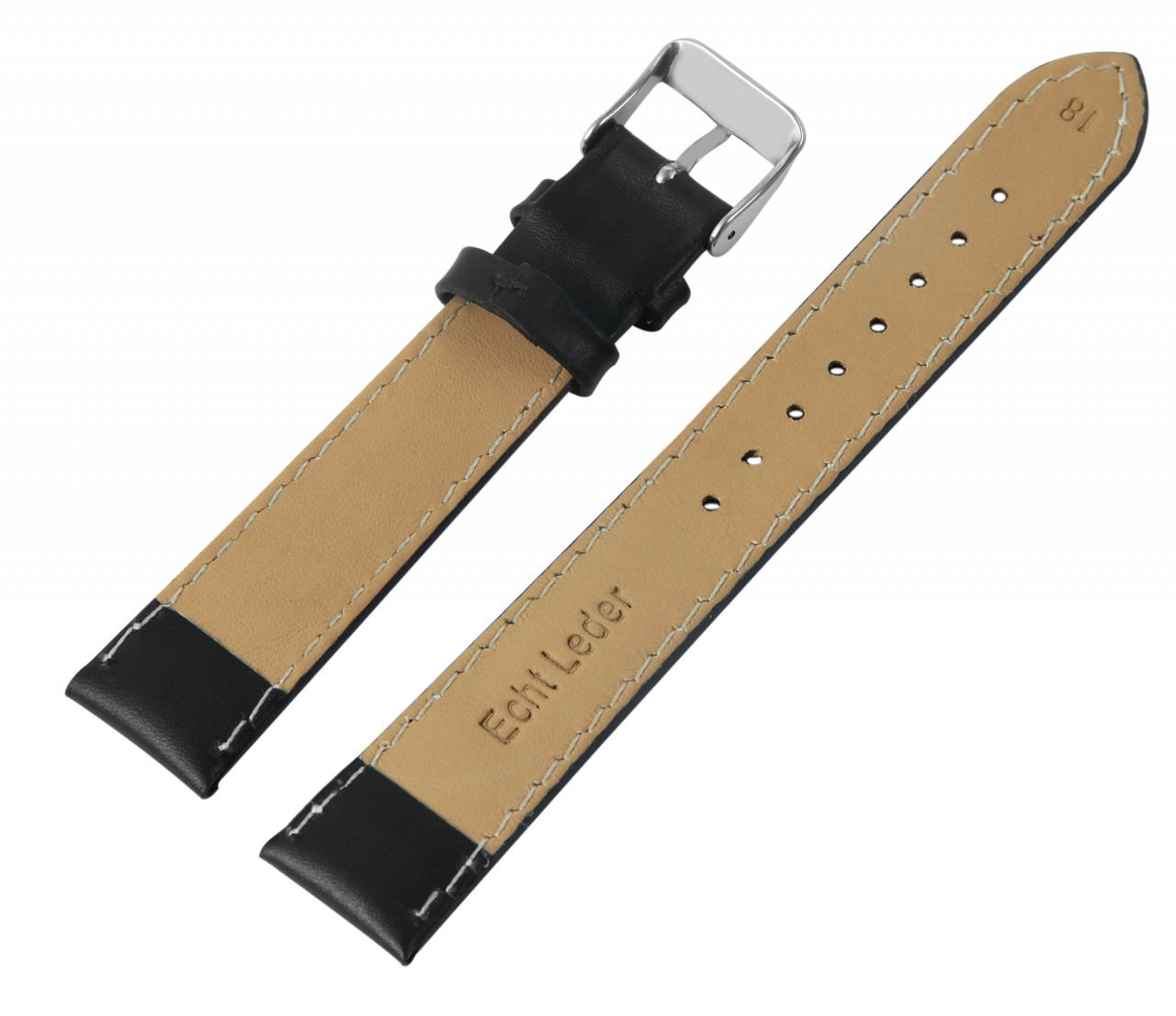 A pulseira preta em couro genuíno está disponível em larguras de 12 mm, 14 mm, 16 mm, 18 mm, 20 mm, 22 mm e 24 mm. Tem uma superfície lisa e acabamento com uma fina costura preta. A pulseira é levemente acolchoada e tem uma espessura de material de aproximadamente 4 mm. A pulseira de substituição tem um comprimento total de 21 cm, que se divide na parte do fecho com 9 cm e na parte do furo com 12 cm. A alça do fecho é 2 mm mais estreita que a largura da alça porque a faixa é estreitamente estreita. A pulseira do relógio pode ser aberta e fechada usando uma fivela prateada e o primeiro laço é costurado.