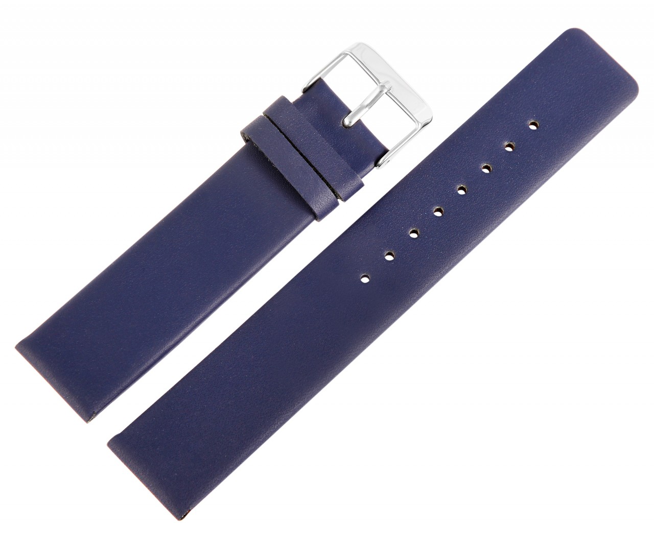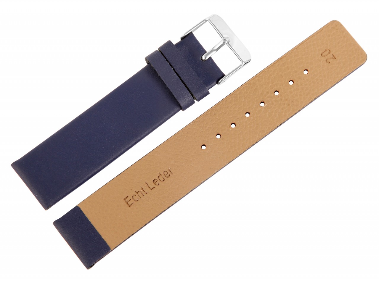 A pulseira do relógio azul escuro é feita de couro genuíno e está disponível em larguras de 14 mm, 16 mm, 18 mm, 20 mm e 22 mm. O comprimento total da banda está entre 20,5 cm e 22 cm e a espessura do material é de 2 mm. O comprimento depende da largura do talão. A pulseira de reposição pode ser aberta e fechada com uma fivela prateada altamente polida. O acabamento brilhante em combinação com a pulseira de couro levemente fosca sublinha o belo design da pulseira do relógio e garante que ela possa ser colocada e retirada com rapidez e facilidade.
