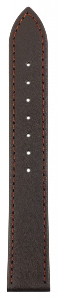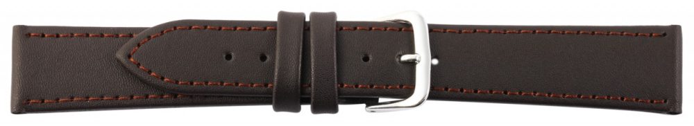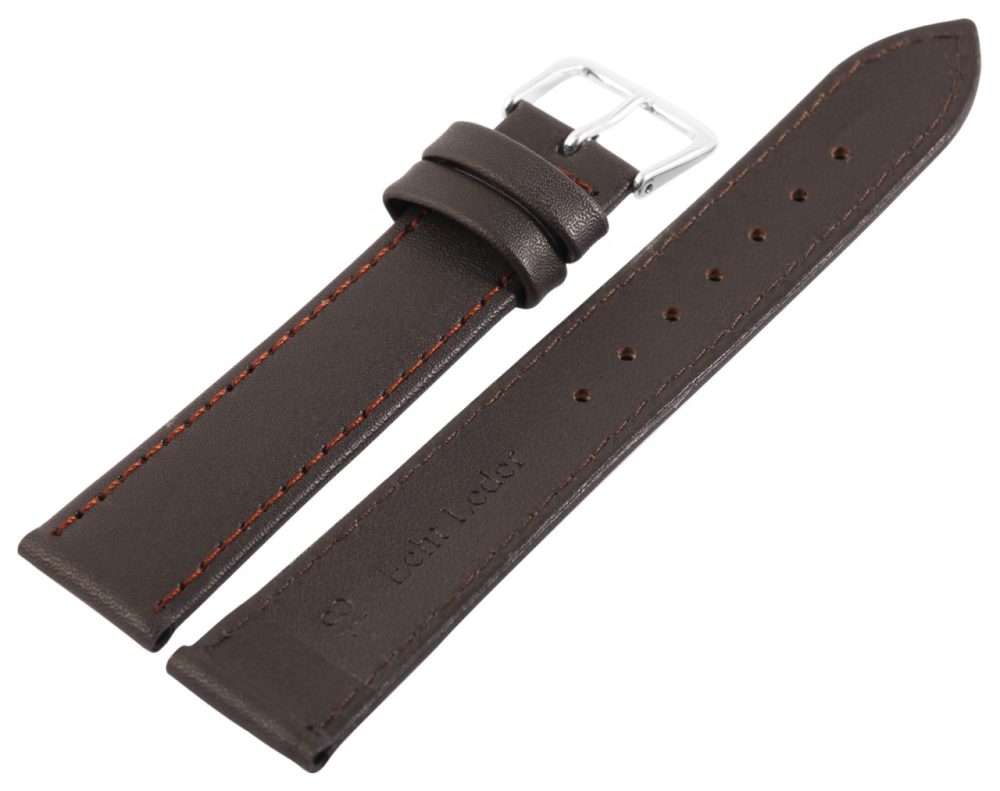 A pulseira castanha escura feita de couro genuíno está disponível em larguras de 18 mm, 20 mm, 22 mm e 24 mm. Tem uma superfície lisa e acabamento com uma fina costura castanha escura. A pulseira de reposição tem comprimento total de 20 cm e espessura de material de 2 mm. A alça do fecho é 2 mm mais estreita que a largura da alça porque a faixa é estreitamente estreita. A pulseira simples do relógio pode ser aberta e fechada com uma fivela prateada.