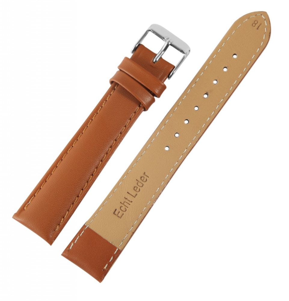 A pulseira castanha feita de couro genuíno está disponível em larguras de 10 mm a 24 mm. Tem uma superfície lisa, é levemente acolchoada e tem uma fina costura castanha. A espessura do material é de 3,5 mm. A pulseira de substituição tem um comprimento total entre 21 cm e 22 cm, que depende da largura da saliência. A alça do fecho é 2 mm mais estreita que a largura da alça porque a faixa é estreitamente estreita. A pulseira pode ser aberta e fechada com uma fivela prateada altamente polida. O acabamento brilhante em combinação com a pulseira de couro liso sublinha o belo design da pulseira do relógio e garante uma colocação e retirada rápida e fácil. Você também pode dar um novo visual ao seu relógio rapidamente com esta pulseira.