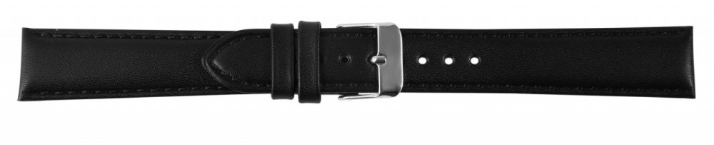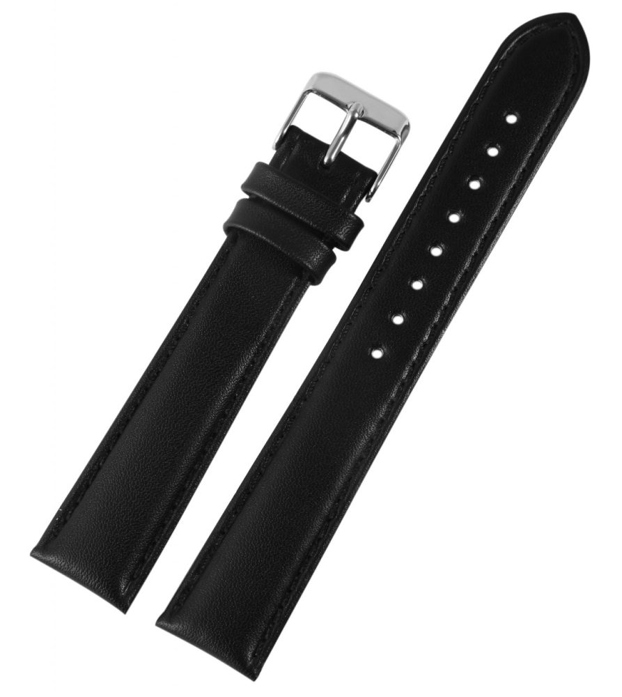 A pulseira preta feita de couro genuíno está disponível em larguras de 10 mm a 24 mm. Tem uma superfície lisa, é levemente acolchoada e tem uma fina costura preta. A espessura do material é de 3 mm. A pulseira de substituição tem um comprimento total entre 20,5 cm e 22 cm, que depende da largura da saliência. A alça do fecho é 2 mm mais estreita que a largura da alça porque a faixa é estreitamente estreita. A pulseira pode ser aberta e fechada com uma fivela prateada altamente polida. O acabamento brilhante em combinação com a pulseira de couro liso sublinha o belo design da pulseira do relógio e garante uma colocação e retirada rápida e fácil. Você também pode dar um novo visual ao seu relógio rapidamente com esta pulseira.
