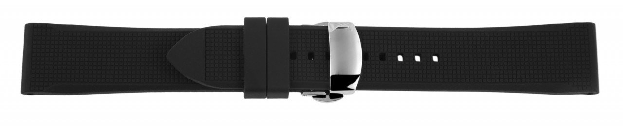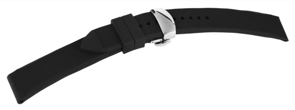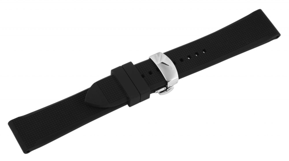 A pulseira de silicone preta está disponível em larguras de 18 mm, 20 mm e 22 mm. Possui uma superfície lisa perfurada com um padrão xadrez fino e pouco visível. A espessura do material é de 4 mm. A pulseira de substituição tem um comprimento total entre 19 cm e 21 cm. O comprimento total depende do terminal da pulseira. A pulseira de silicone pode ser aberta e fechada usando um fecho dobrável tipo borboleta prateado feito de aço inoxidável. A alça do fecho é 2 mm mais estreita que a alça da pulseira porque a pulseira é cônica. A pulseira de silicone oferece alto nível de conforto graças ao material macio.