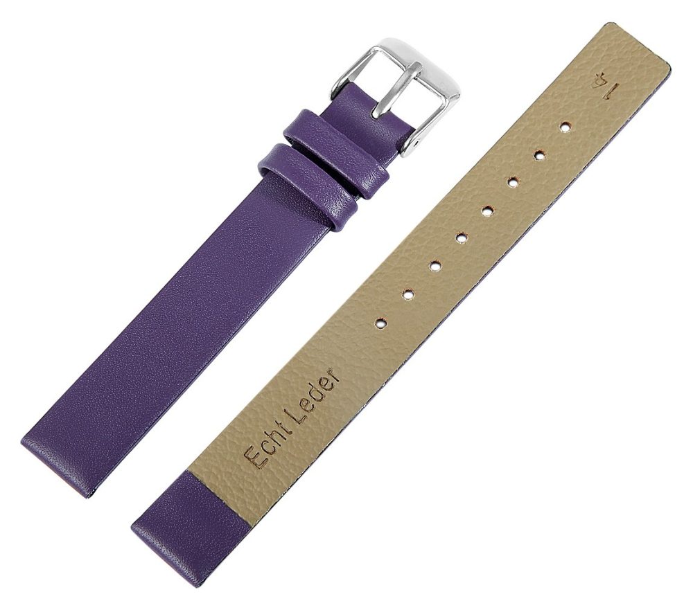 A pulseira roxa do relógio é feita de couro genuíno e está disponível em larguras de 14 mm, 16 mm, 18 mm, 20 mm e 22 mm. O comprimento total da banda está entre 20,5 cm e 22 cm e a espessura do material é de 3 mm. O comprimento depende da largura do talão. A pulseira de substituição pode ser aberta e fechada com uma fivela prateada altamente polida. Os elementos brilhantes da pulseira sublinham o belo design e dão ao seu relógio uma aparência renovada.