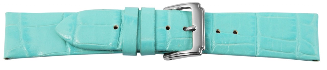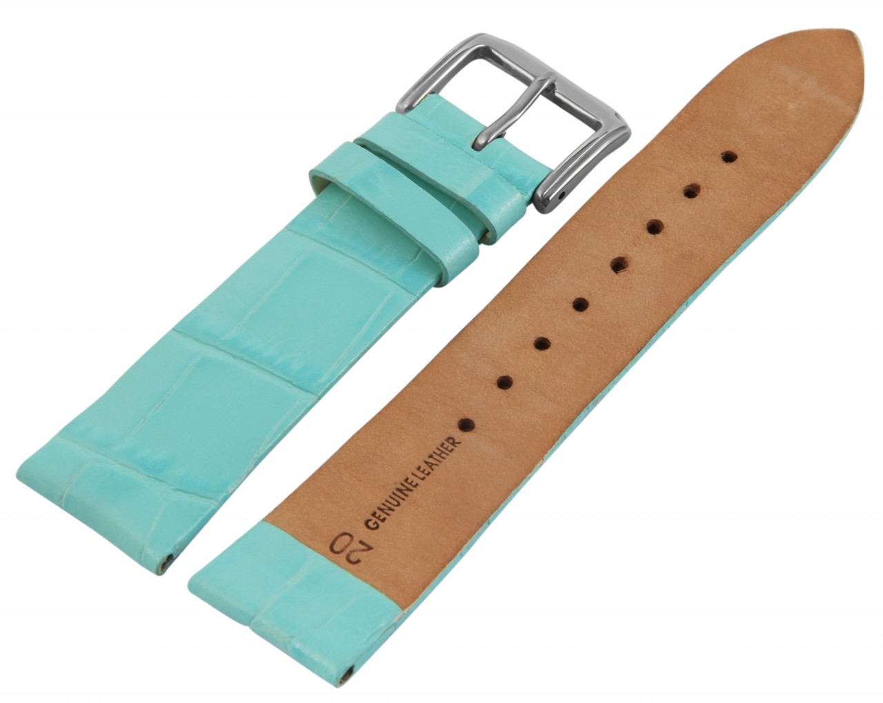Pulseira clássica de substituição em couro genuíno na cor turquesa. É feito do melhor couro bovino e gravado com um design de couro de crocodilo. A pulseira tem uma fivela prateada e duas presilhas. A parte do furo afunila até uma ponta no final.