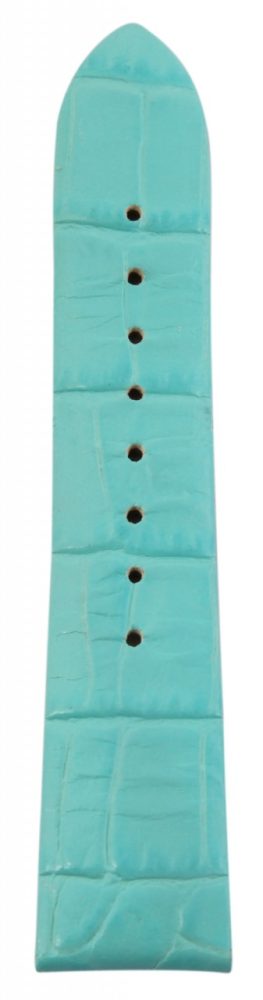 Pulseira clássica de substituição em couro genuíno na cor turquesa. É feito do melhor couro bovino e gravado com um design de couro de crocodilo. A pulseira tem uma fivela prateada e duas presilhas. A parte do furo afunila até uma ponta no final.