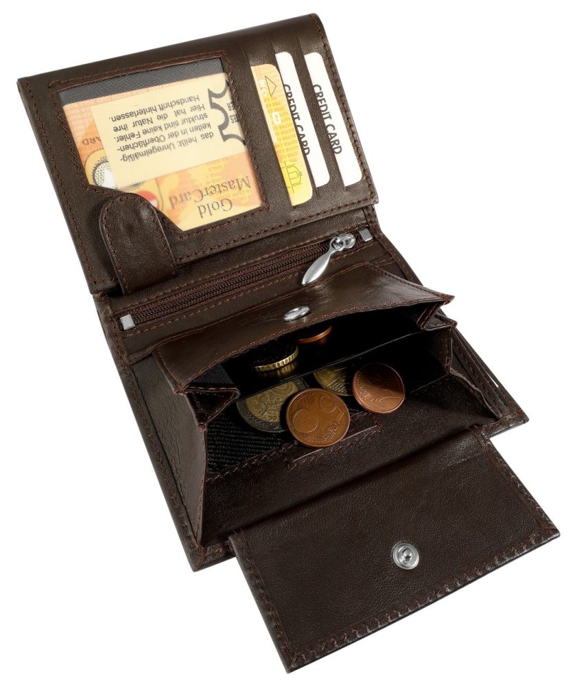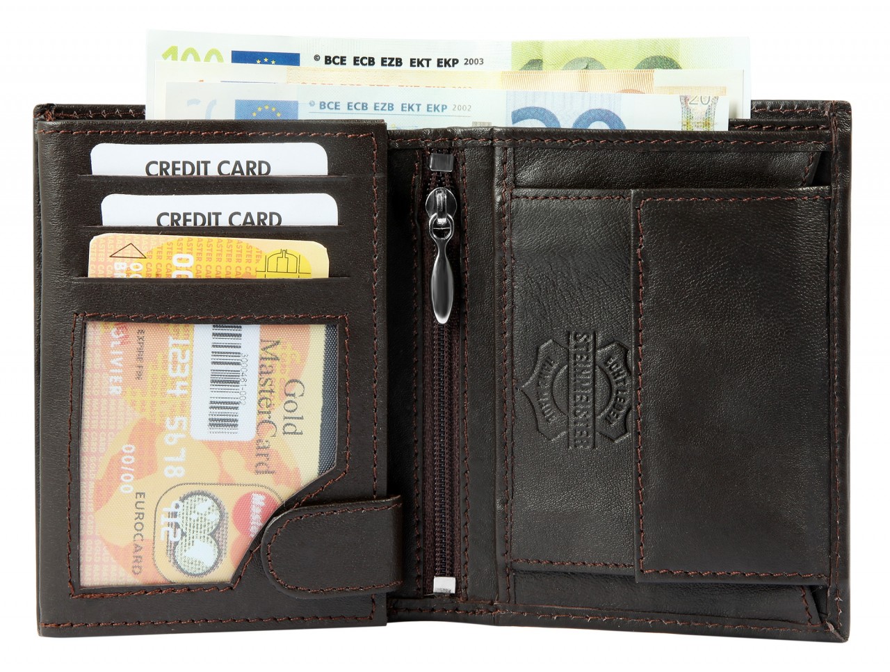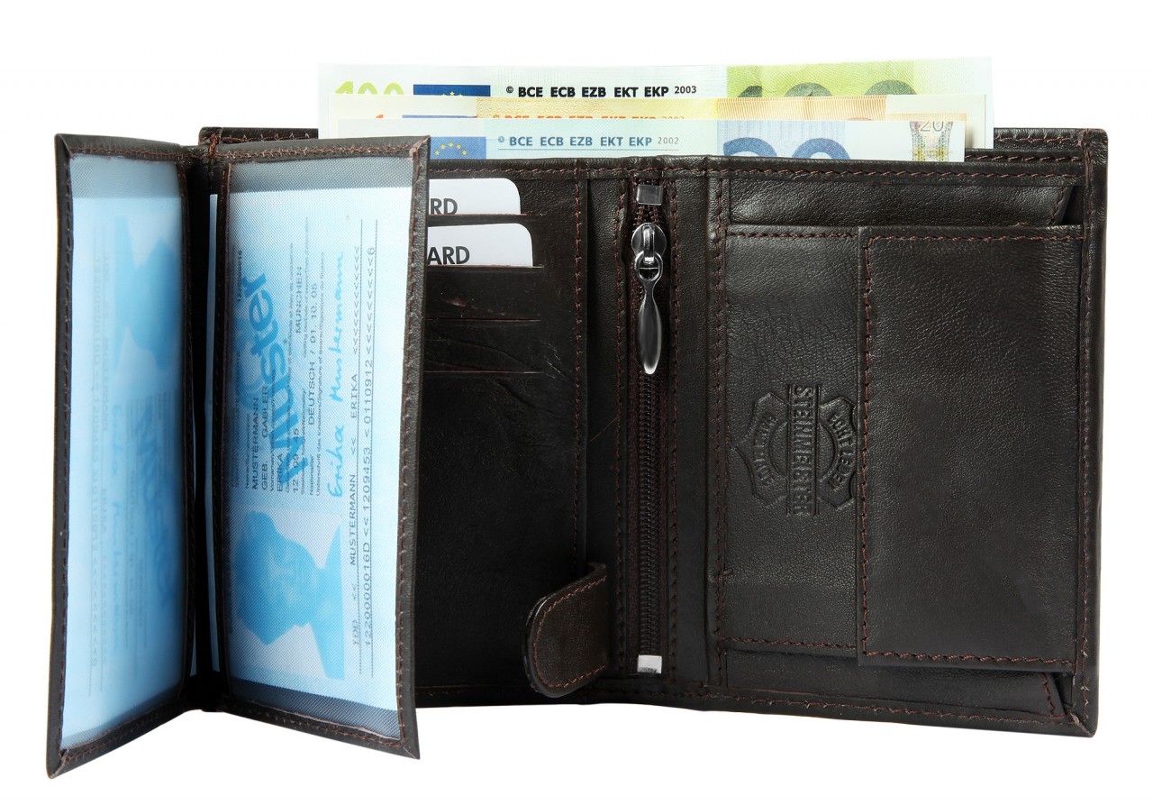 A carteira masculina da marca Mestre Artesão é confecionada em formato retrato em couro genuíno de cordeiro e possui superfície lisa. A sensação do couro é particularmente macia e flexível. A carteira é um verdadeiro milagre de espaço e oferece muito espaço de armazenamento para todos os documentos importantes. A carteira está dividida em onze compartimentos para cartões de crédito, dois compartimentos para notas, um compartimento para moedas com divisória e um compartimento para fichas de compras, dois compartimentos transparentes para identificação, dois bolsos deslizantes e um compartimento com fecho. Os cartões são protegidos por meio de um botão. As dimensões da carteira são 12,1 cm de comprimento, 9,5 cm de largura e 2,5 cm de altura.