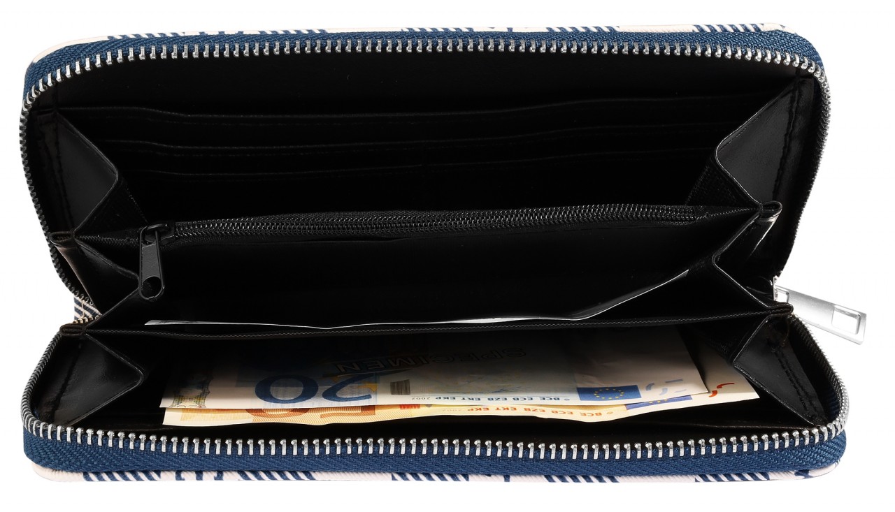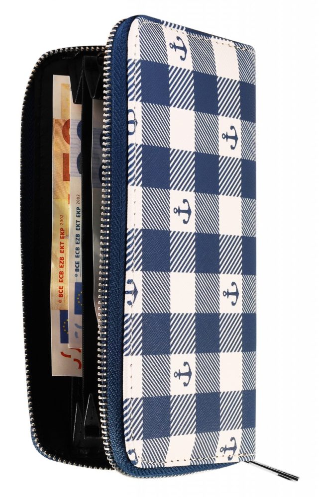 A carteira marítima em formato de paisagem é feita de imitação de couro. O forro interior é feito de material sintético. A carteira tem 3 compartimentos para notas, um pequeno compartimento para trocos com fecho de correr, 8 ranhuras para cartões de crédito e 2 compartimentos de encaixe. A carteira não só chama a atenção, como também economiza espaço. Tudo pode ser guardado de forma segura com um fecho de correr no exterior. O tamanho resulta de um comprimento de 10 cm, uma largura de 19 cm e uma espessura de 3 cm.