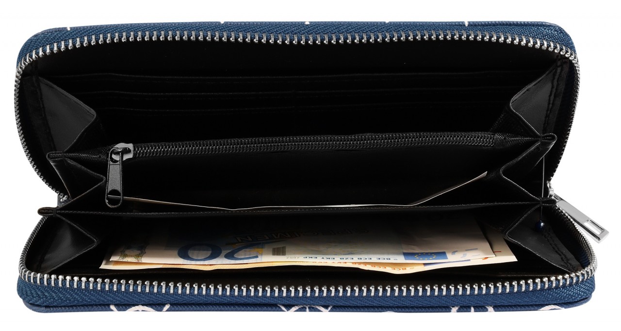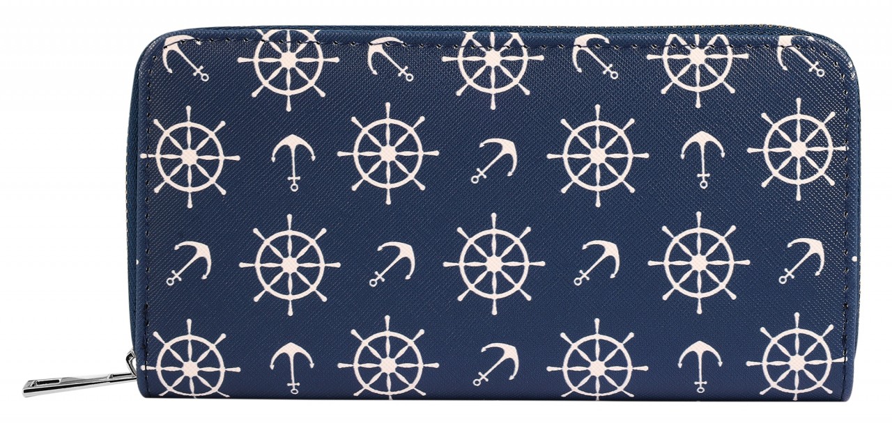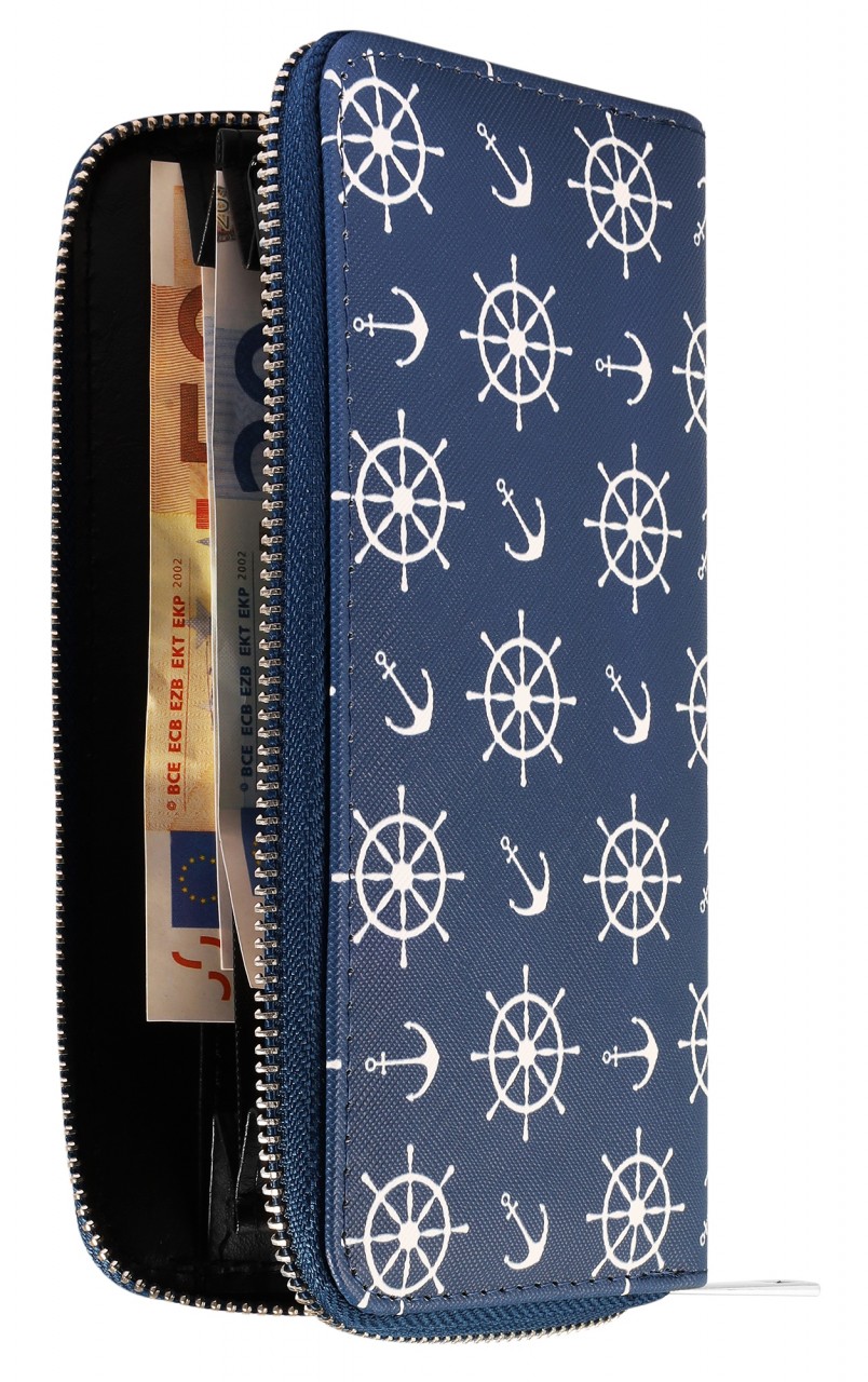 A carteira marítima em formato de paisagem é feita de imitação de couro. O forro interior é feito de material sintético. A carteira tem 3 compartimentos para notas, um pequeno compartimento para trocos com fecho de correr, 8 ranhuras para cartões de crédito e 2 compartimentos de encaixe. A carteira não só chama a atenção, como também economiza espaço. Tudo pode ser guardado de forma segura com um fecho de correr no exterior. O tamanho resulta de um comprimento de 10 cm, uma largura de 19 cm e uma espessura de 3 cm.