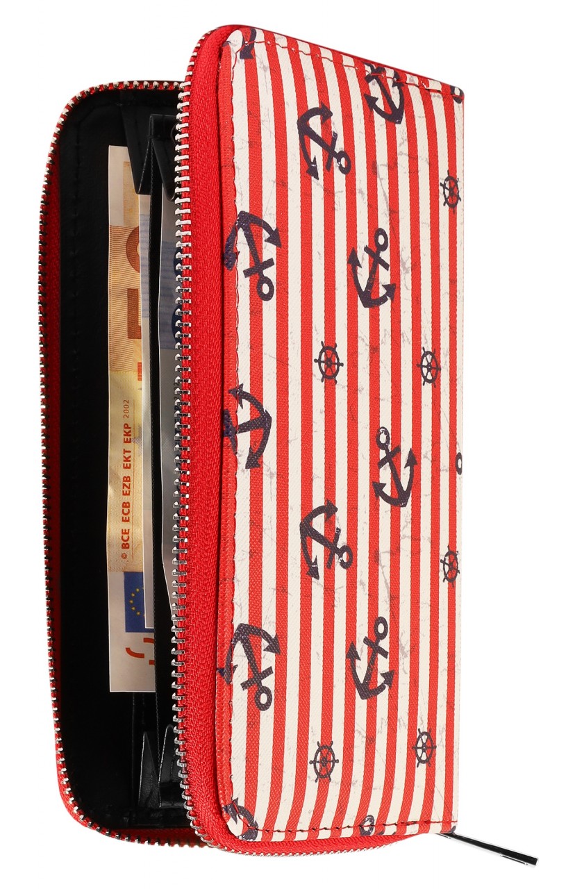 A carteira marítima em formato de paisagem é feita de imitação de couro. O forro interior é feito de material sintético. A carteira tem 3 compartimentos para notas, um pequeno compartimento para trocos com fecho de correr, 8 ranhuras para cartões de crédito e 2 compartimentos de encaixe. A carteira não só chama a atenção, como também economiza espaço. Tudo pode ser guardado de forma segura com um fecho de correr no exterior. O tamanho resulta de um comprimento de 10 cm, uma largura de 19 cm e uma espessura de 3 cm.