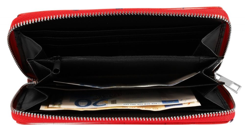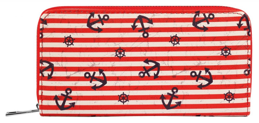A carteira marítima em formato de paisagem é feita de imitação de couro. O forro interior é feito de material sintético. A carteira tem 3 compartimentos para notas, um pequeno compartimento para trocos com fecho de correr, 8 ranhuras para cartões de crédito e 2 compartimentos de encaixe. A carteira não só chama a atenção, como também economiza espaço. Tudo pode ser guardado de forma segura com um fecho de correr no exterior. O tamanho resulta de um comprimento de 10 cm, uma largura de 19 cm e uma espessura de 3 cm.