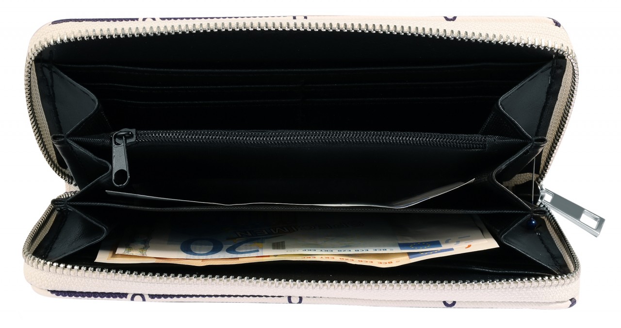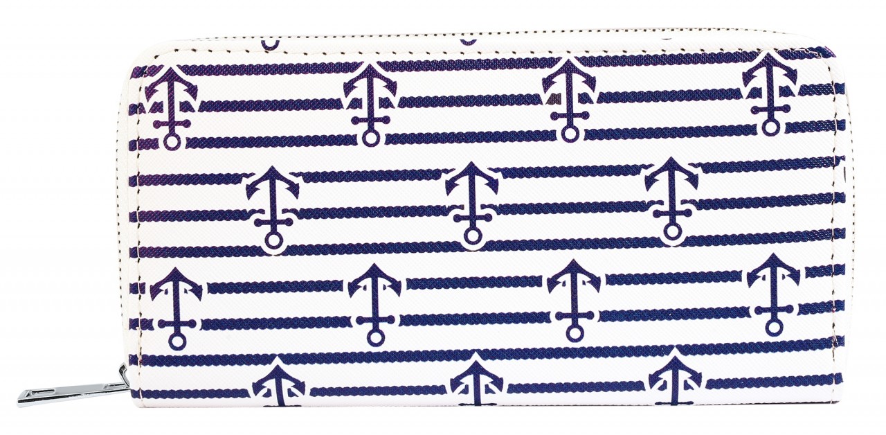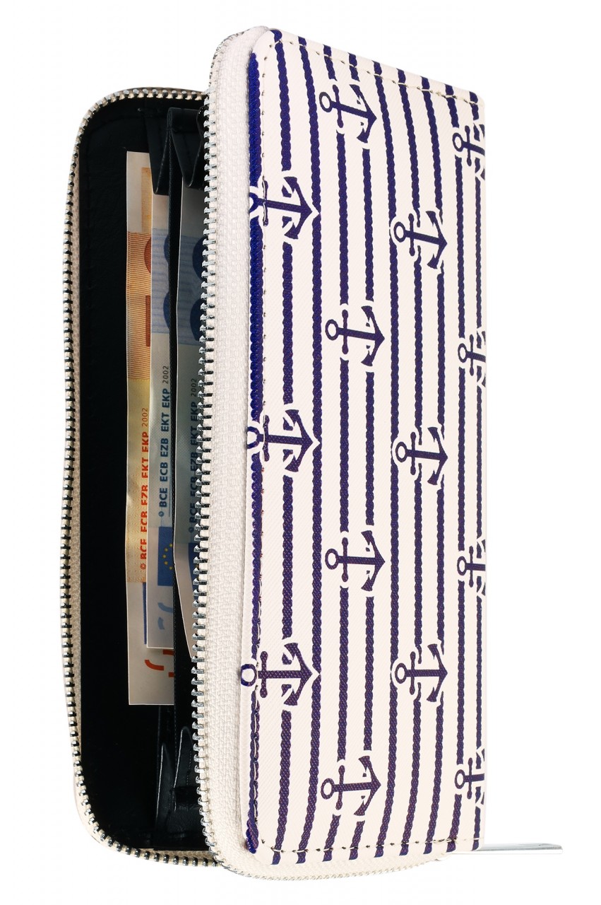 A carteira marítima em formato de paisagem é feita de imitação de couro. O forro interior é feito de material sintético. A carteira tem 3 compartimentos para notas, um pequeno compartimento para trocos com fecho de correr, 8 ranhuras para cartões de crédito e 2 compartimentos de encaixe. A carteira não só chama a atenção, como também economiza espaço. Tudo pode ser guardado de forma segura com um fecho de correr no exterior. O tamanho resulta de um comprimento de 10 cm, uma largura de 19 cm e uma espessura de 3 cm.