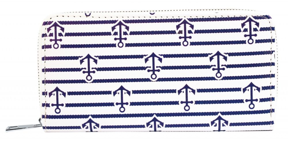 A carteira marítima em formato de paisagem é feita de imitação de couro. O forro interior é feito de material sintético. A carteira tem 3 compartimentos para notas, um pequeno compartimento para trocos com fecho de correr, 8 ranhuras para cartões de crédito e 2 compartimentos de encaixe. A carteira não só chama a atenção, como também economiza espaço. Tudo pode ser guardado de forma segura com um fecho de correr no exterior. O tamanho resulta de um comprimento de 10 cm, uma largura de 19 cm e uma espessura de 3 cm.