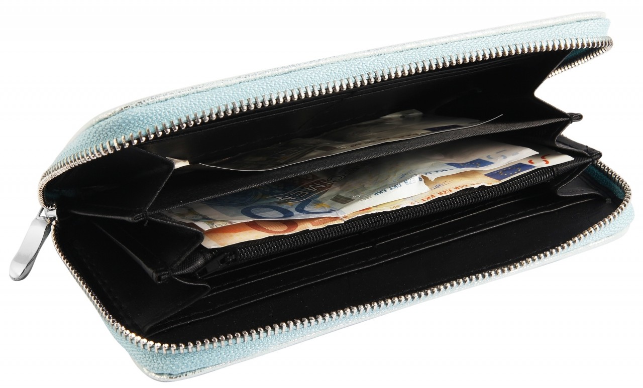 A carteira de senhora da marca Cham Cham é feita de imitação de pele em formato horizontal e tem um efeito metálico moderno com finas partículas de brilho em forma de estrela. As costuras no exterior e no interior da carteira garantem uma boa durabilidade e estabilidade. A carteira é uma verdadeira poupança de espaço e oferece muito espaço de armazenamento para todos os seus documentos importantes. É uma fiel companheira de viagem e, ao mesmo tempo, está super na moda. A carteira está dividida em 8 compartimentos para cartões de crédito, 3 compartimentos para notas, 1 compartimento para moedas com fecho de correr e 2 compartimentos de encaixe. O tamanho da carteira vazia é de 10 cm de comprimento,…