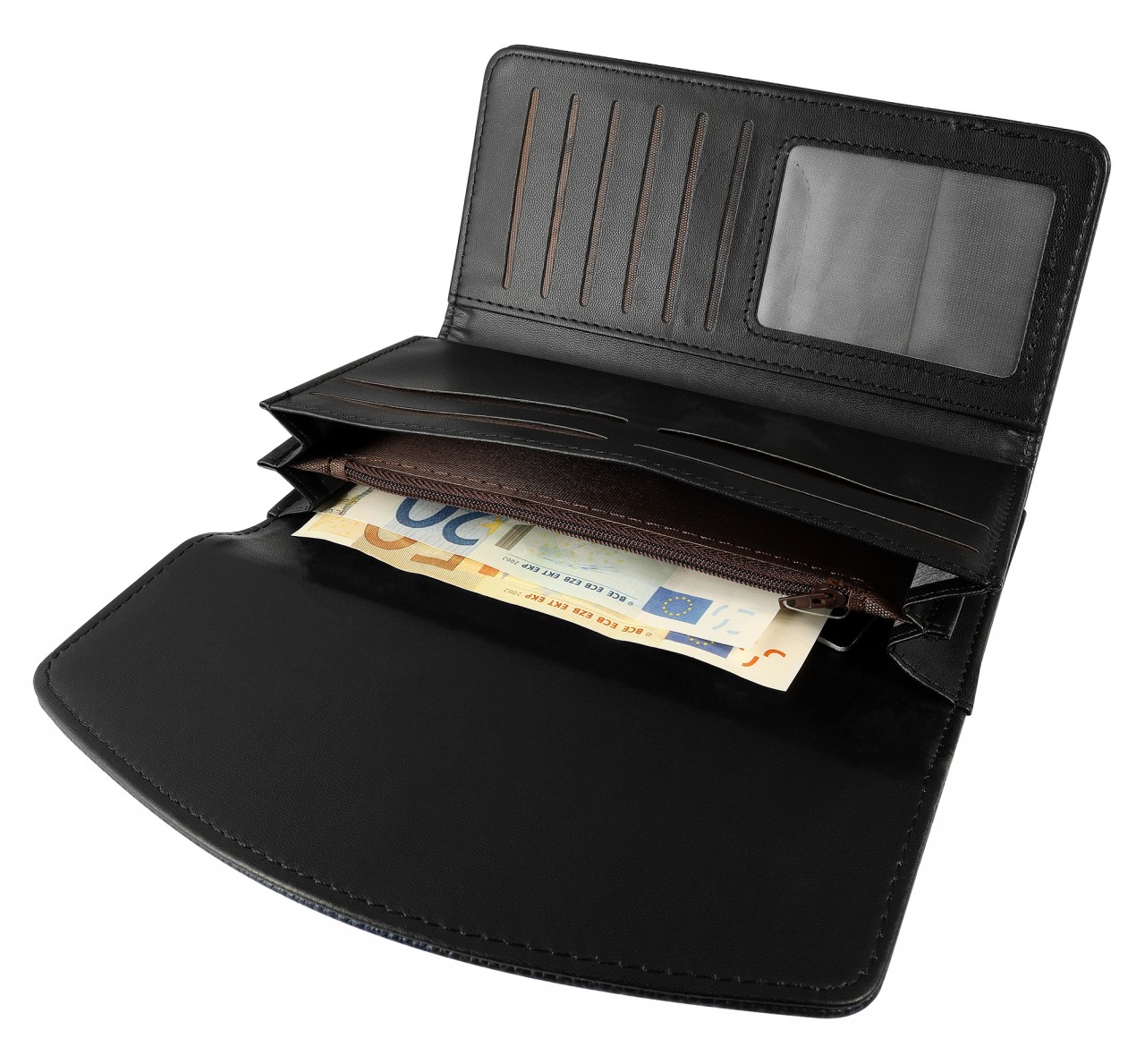 A carteira é desenhada em formato paisagem em imitação de couro e está disponível em diversas cores. Com um tamanho de 10,1 x 19 x 4 cm, oferece a combinação ideal de tamanho prático e espaço de armazenamento suficiente. A aba, que pode ser aberta com um botão, proporciona acesso conveniente ao interior bem pensado. Dentro desta carteira há dois compartimentos para notas e um compartimento para moedas, que é protegido por um zíper confiável. Porém, o charme especial da bolsa é revelado pela aba dobrável. Este design inteligente dá acesso a 10 compartimentos para cartão de crédito, um bolso transparente para identificação e um bolso adicional. O manuseio prático e o design elegante fazem desta carteira feminina uma companheira indispensável no dia a dia. O fecho de pressão de alta qualidade e o material cuidadosamente selecionado prometem durabilidade e uso elegante.
