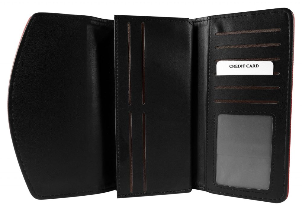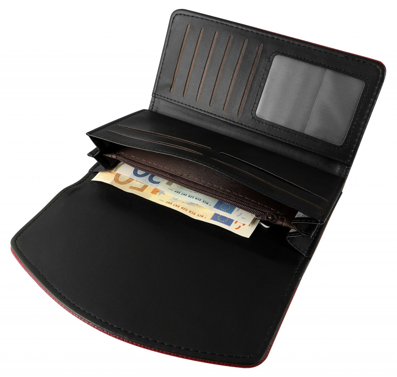 A carteira é desenhada em formato paisagem em imitação de couro e está disponível em diversas cores. Com um tamanho de 10,1 x 19 x 4 cm, oferece a combinação ideal de tamanho prático e espaço de armazenamento suficiente. A aba, que pode ser aberta com um botão, proporciona acesso conveniente ao interior bem pensado. Dentro desta carteira há dois compartimentos para notas e um compartimento para moedas, que é protegido por um zíper confiável. Porém, o charme especial da bolsa é revelado pela aba dobrável. Este design inteligente dá acesso a 10 compartimentos para cartão de crédito, um bolso transparente para identificação e um bolso adicional. O manuseio prático e o design elegante fazem desta carteira feminina uma companheira indispensável no dia a dia. O fecho de pressão de alta qualidade e o material cuidadosamente selecionado prometem durabilidade e uso elegante.
