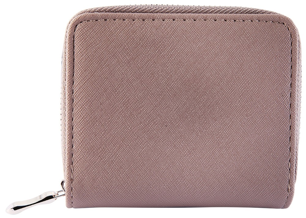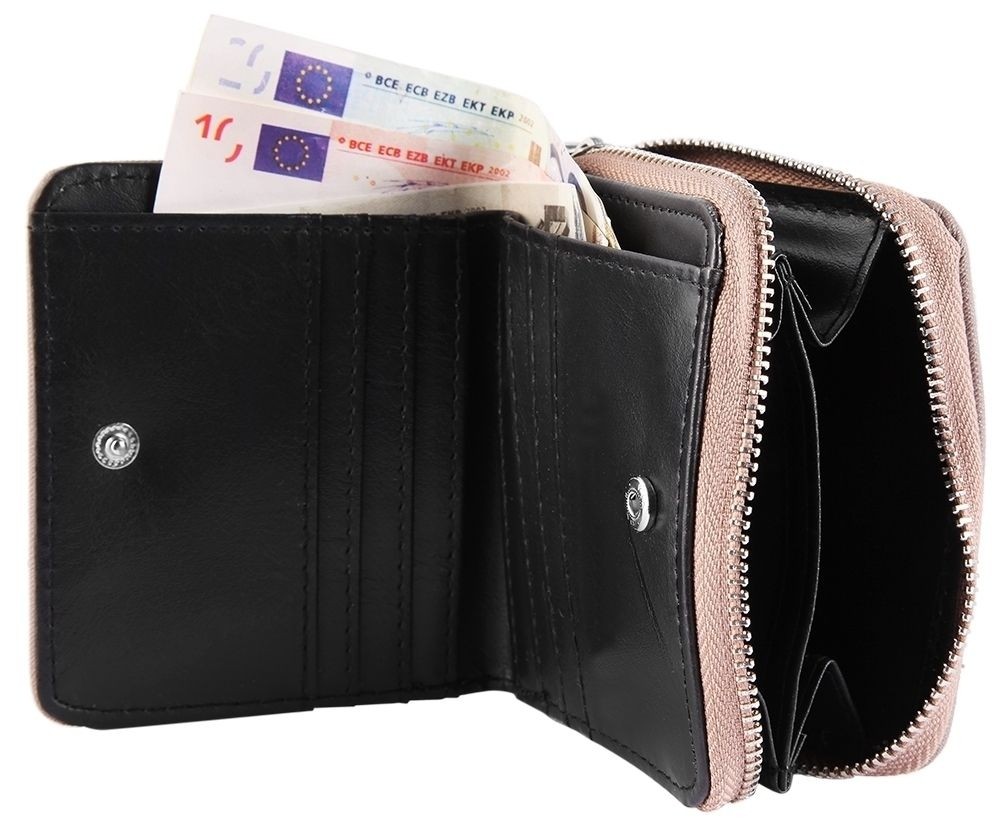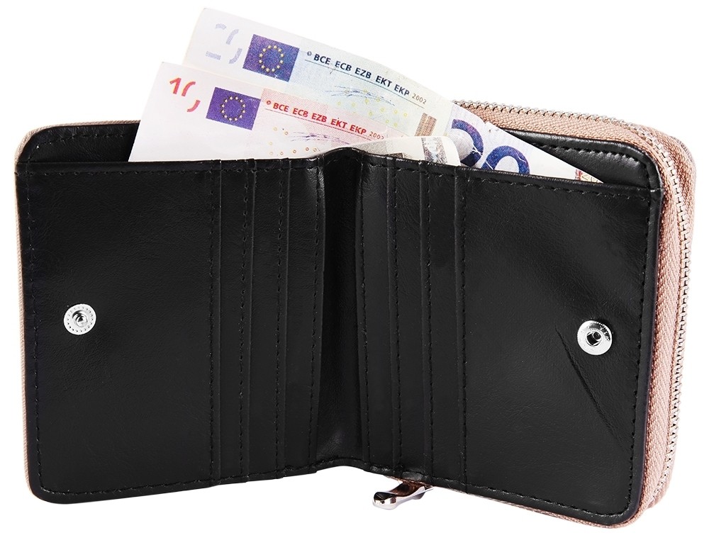 Carteira de senhora em imitação de pele. A carteira de paisagem tem 10 cm de largura e 11 cm de altura. A cor é . A carteira de couro genuíno é fechada com um fecho de pressão. Tem um compartimento para notas, um pequeno compartimento para trocos e 8 ranhuras para cartões de crédito,