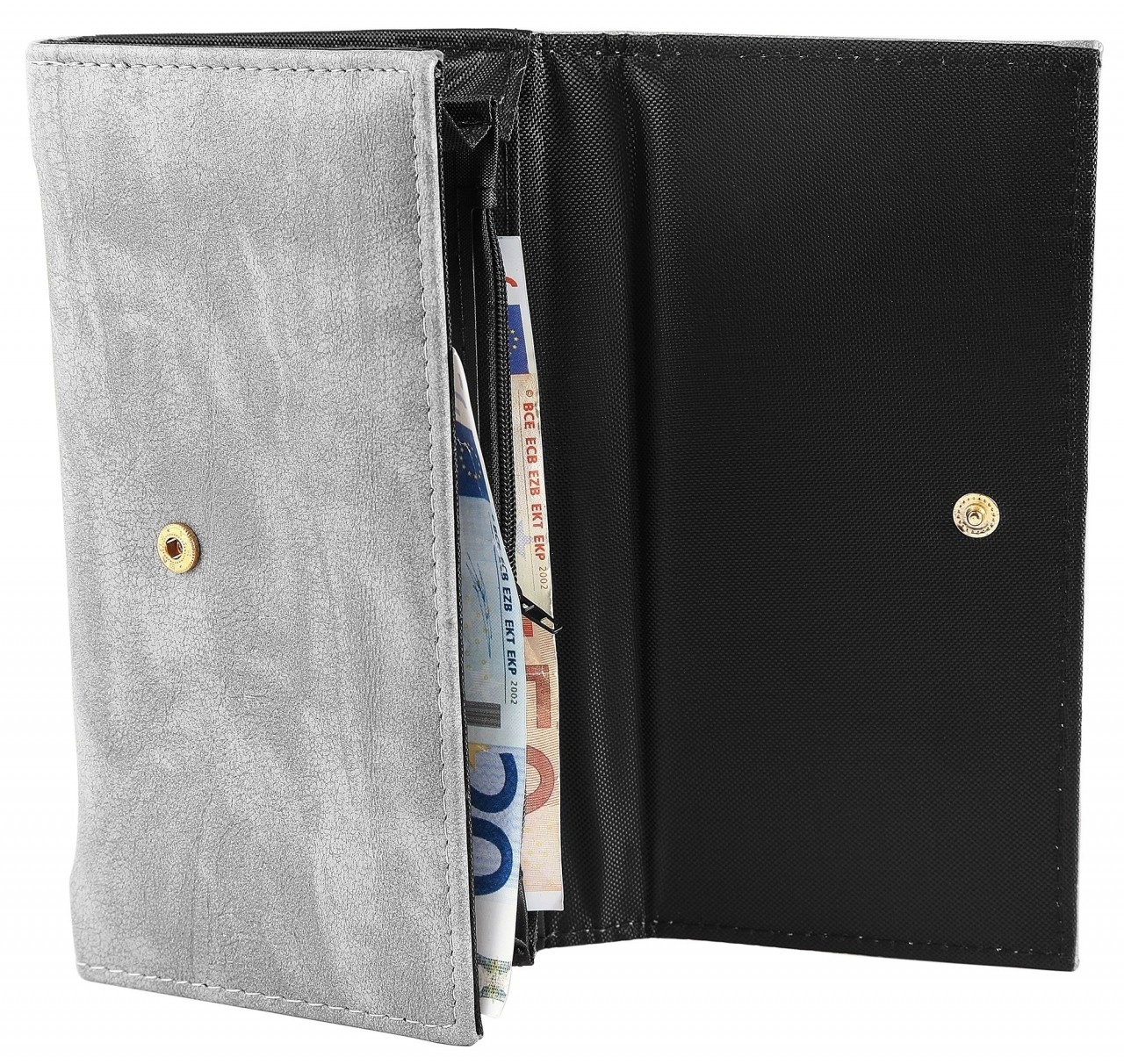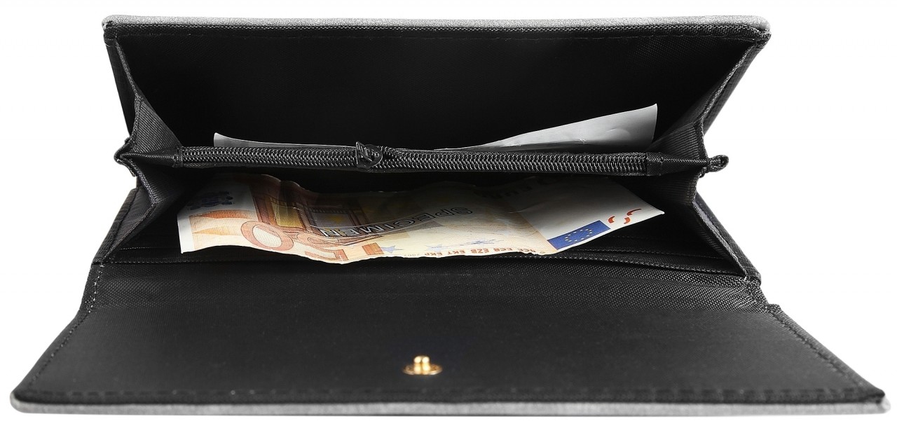 Carteira de senhora em imitação de pele. A carteira de paisagem tem 19 cm de largura e 10 cm de altura. A cor é . A carteira de couro genuíno é fechada com um fecho de pressão. Tem 3 compartimentos para notas, um pequeno compartimento para trocos e 6 ranhuras para cartões de crédito.