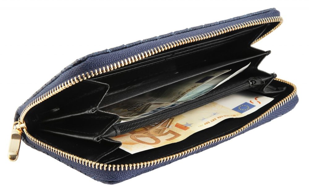 Carteira de senhora em imitação de pele. A carteira de paisagem tem 19 cm de largura e 10 cm de altura. A cor é . A carteira de couro genuíno é fechada com um fecho de correr. Tem 5 compartimentos para notas, um pequeno compartimento para trocos e 8 ranhuras para cartões de crédito.