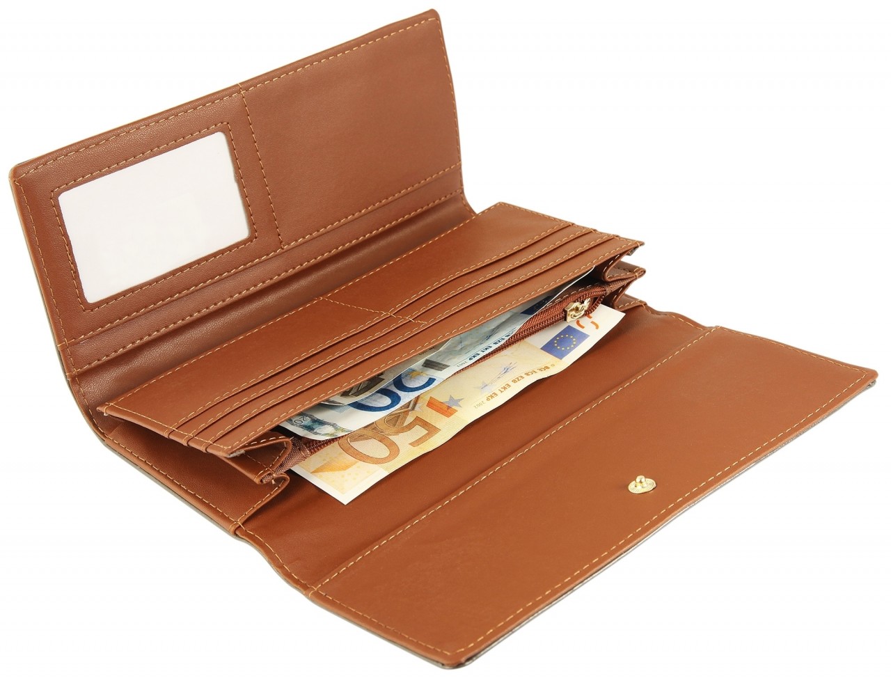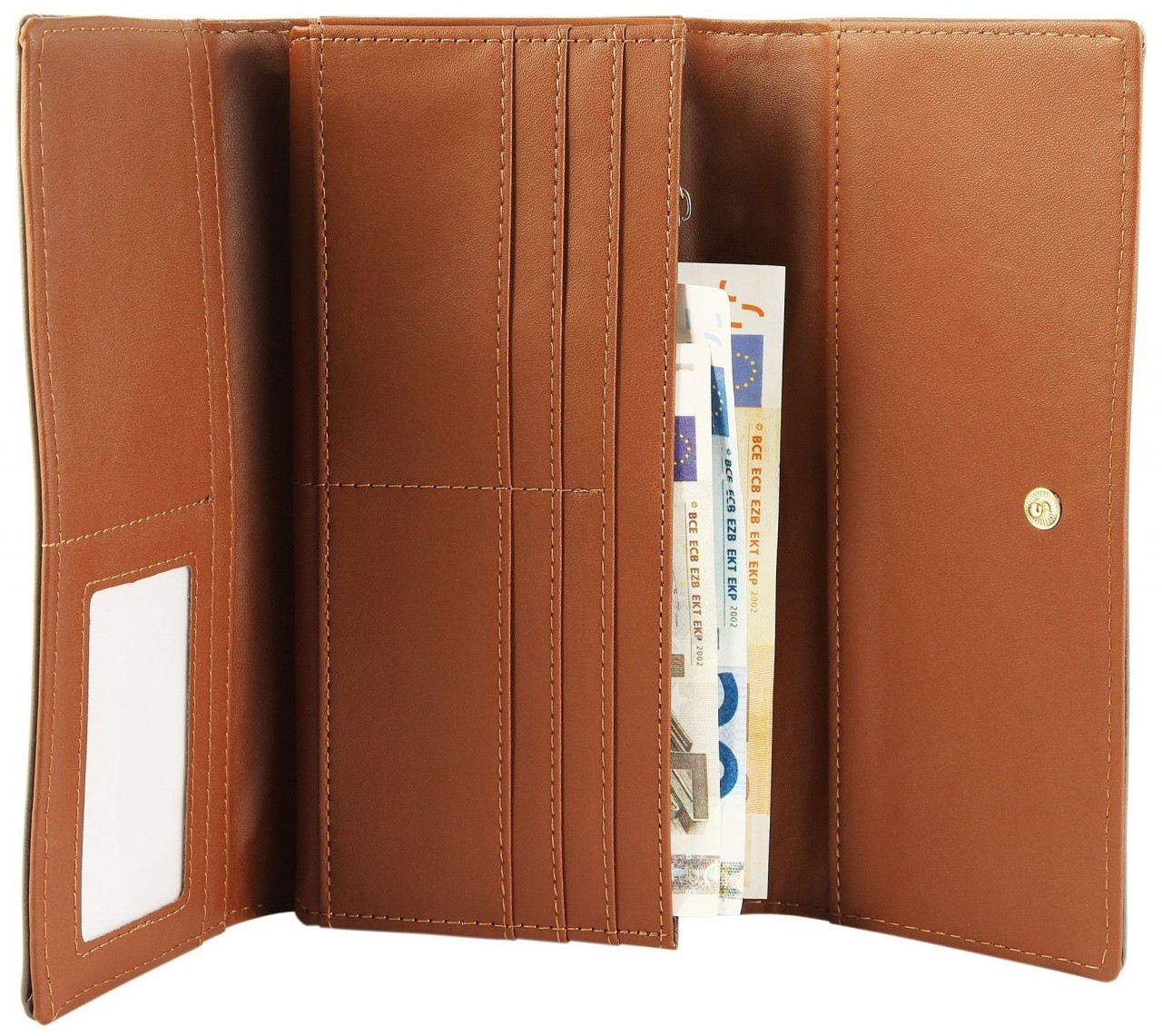 A carteira de senhora da marca Cham Cham é feita de imitação de pele em formato de paisagem. A carteira não é apenas um atrativo, mas também uma verdadeira poupança de espaço e oferece muito espaço de armazenamento para todos os seus documentos importantes. Está dividida em 7 compartimentos para cartões de crédito, 3 compartimentos para notas, 1 compartimento transparente para cartões de crédito e 1 compartimento para moedas com fecho. O tamanho da carteira é de 19 cm de largura e 9 cm de comprimento.