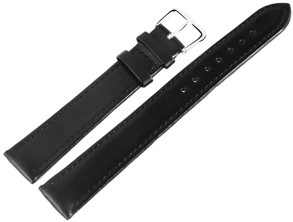 A pulseira preta feita de couro genuíno está disponível em larguras de 10 mm a 24 mm e em uma embalagem de seis peças. Tem uma superfície lisa e acabamento com uma fina costura preta. A espessura do material é de 2 mm. A pulseira de reposição XL tem um comprimento total entre 21,5 cm e 24 cm, dependendo da largura da alça. A alça do fecho é 2 mm mais estreita que a largura da alça porque a faixa é estreitamente estreita. A pulseira de reposição pode ser aberta e fechada com uma fivela prateada altamente polida. O acabamento brilhante em combinação com a pulseira de couro liso sublinha o belo design da pulseira do relógio e garante uma colocação e retirada rápida e fácil.