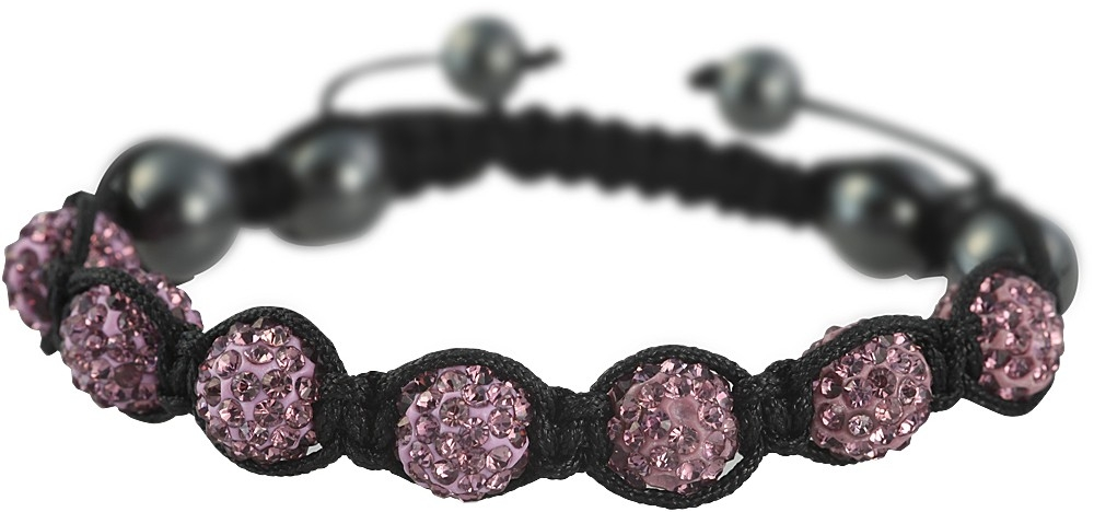 Pulseira em tecido. O plástico é usado como material da segunda banda. A cor da pulseira é preta. O diâmetro é de 60 mm. A largura é de 10mm. A pulseira é decorada com pedras de zircónia rosa.