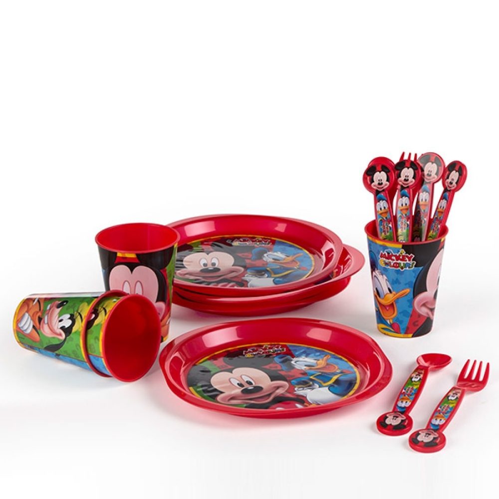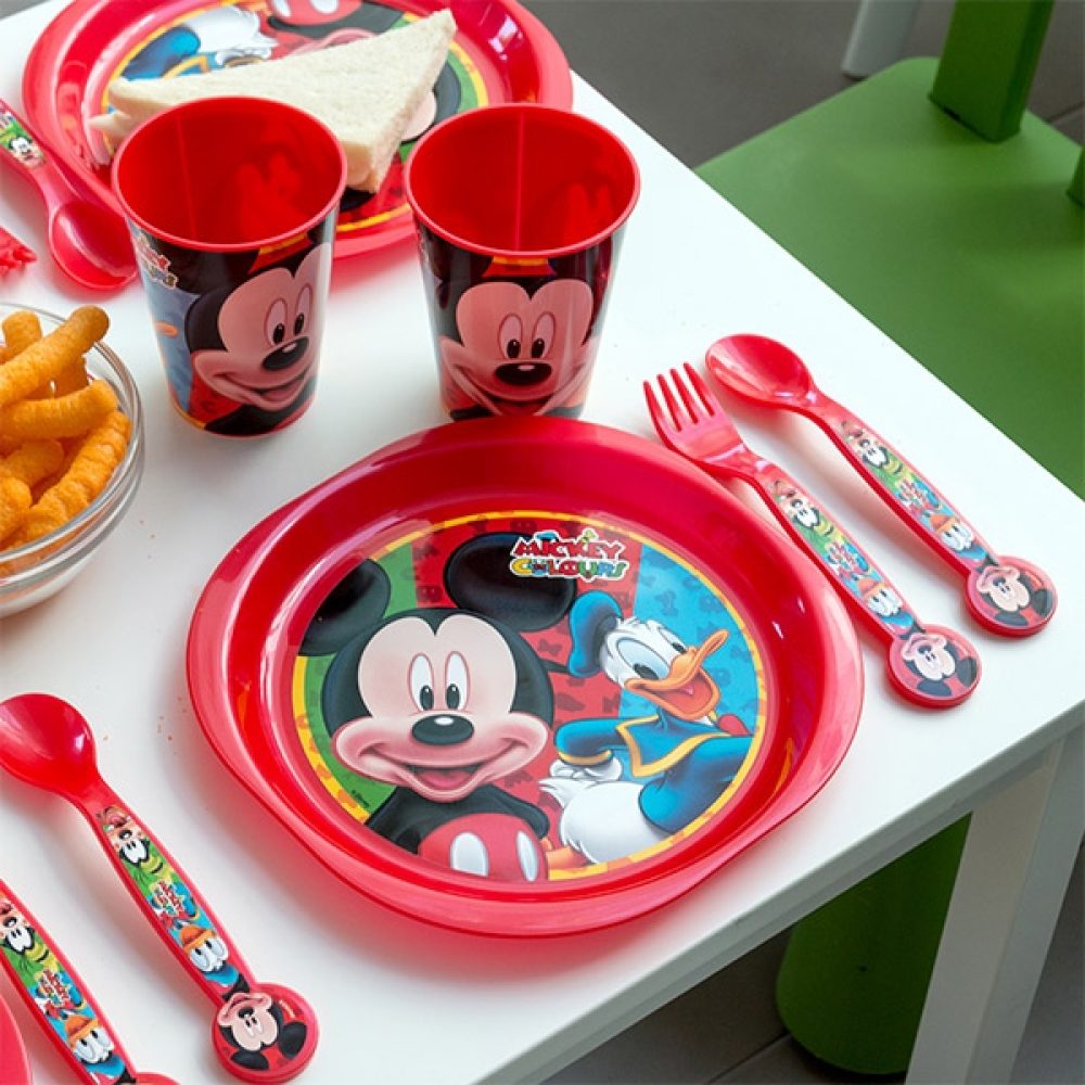 A louça infantil Mickey Mouse (16 peças) é ideal para presentear as crianças. Inclui: 4 pratos, 4 colheres, 4 garfos e 4 copos.