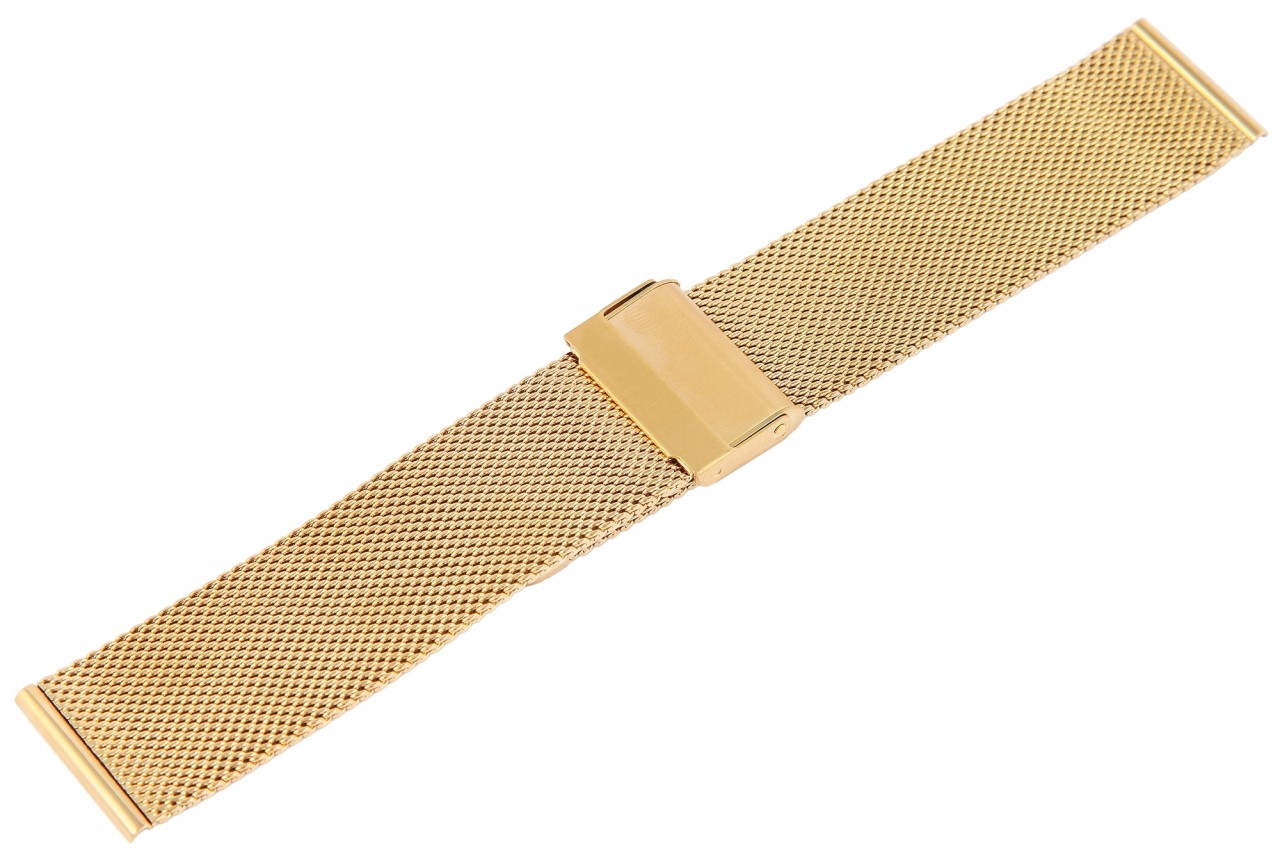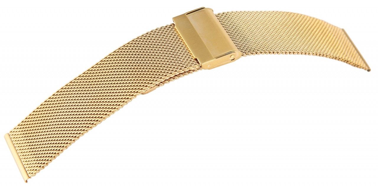 A pulseira do relógio milanês dourada é feita em aço inoxidável e abre e fecha com um fecho de gancho em aço inoxidável dourado. A pulseira de substituição é muito confortável de usar graças ao seu design especial e pode ser perfeitamente ajustada a qualquer pulso graças ao ajuste fino. O comprimento total da pulseira do relógio é de 19 cm. A pulseira milanesa está disponível em larguras de 10 mm, 12 mm, 14 mm, 16 mm, 18 mm, 20 mm, 22 mm e 24 mm. A alça é reta e, portanto, compatível com todos os relógios. A pulseira milanesa torna cada relógio um destaque visual.