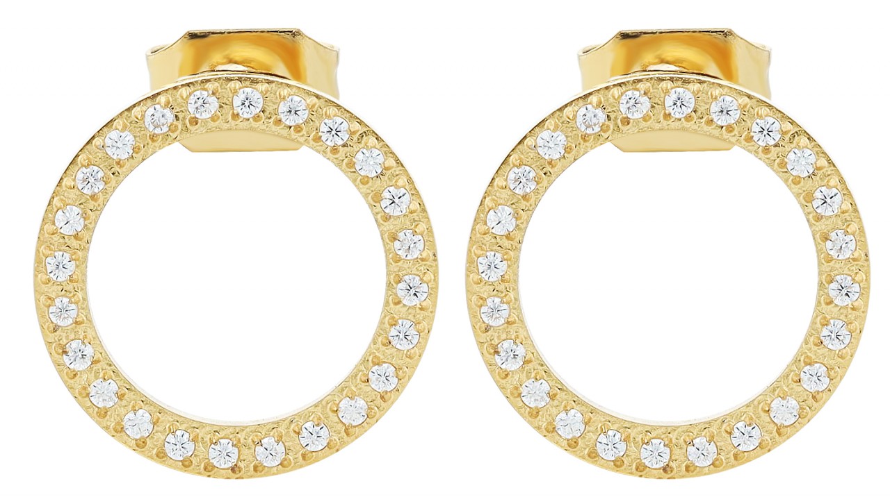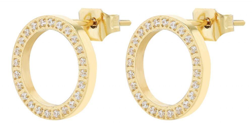 Os brincos de filigrana em formato redondo são feitos de aço inoxidável de alta qualidade. Os brincos são abertos no meio e decorados ao redor com 24 pedras brilhantes. Os brincos podem ser fixados na parte de trás do furo da orelha com um parafuso de orelhas, também feito de aço inoxidável. O tamanho resulta de um diâmetro de 11 mm e uma espessura de 1,5 mm.